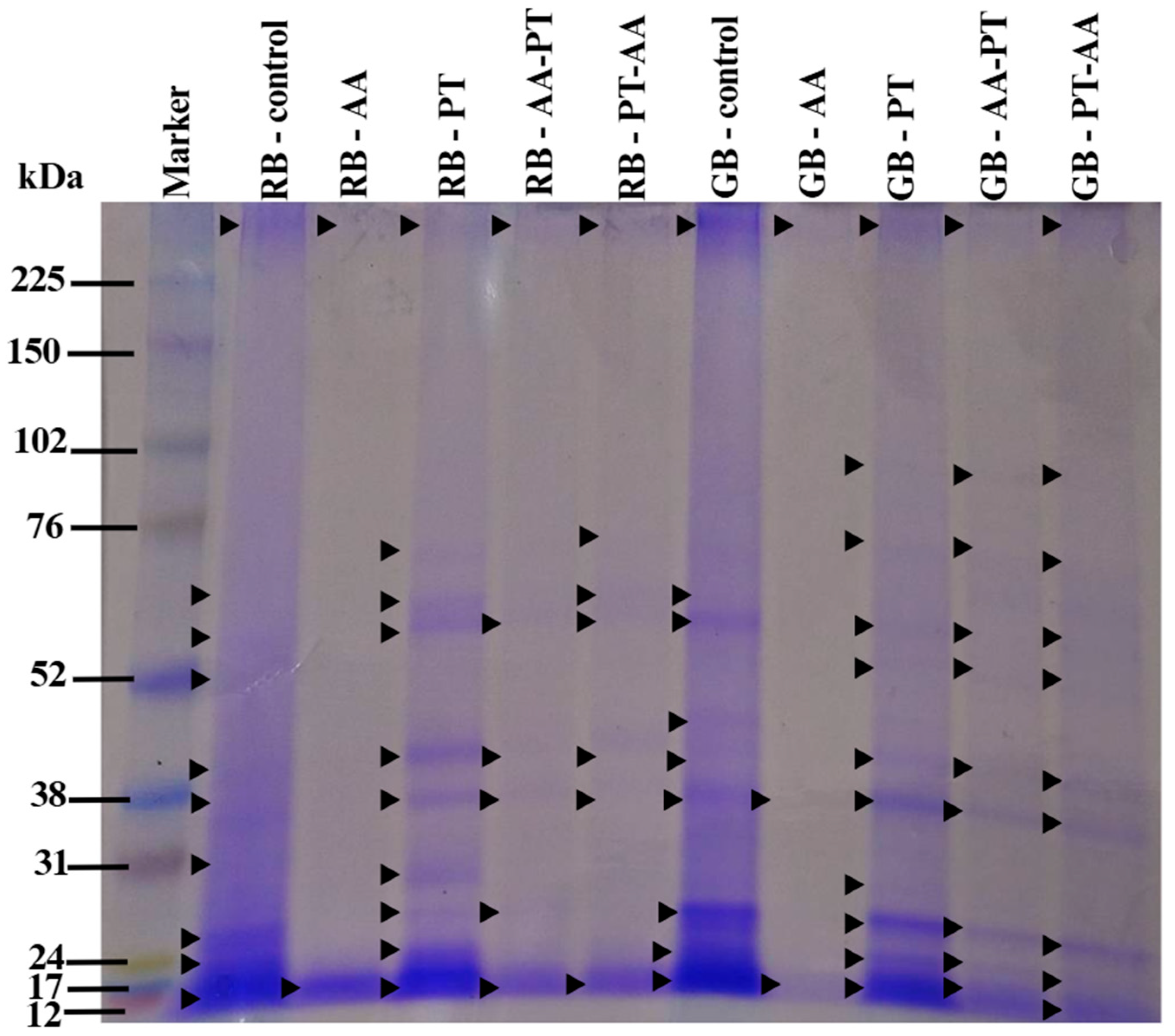 | Protein and Amino Acid Content (mg/g DW) | RB-Control | RB-AA | RB-PT | RB-AA-PT | RB-PT-AA | GB-Control | GB-AA | GB-PT | GB-AA-PT | GB-PT-AA |