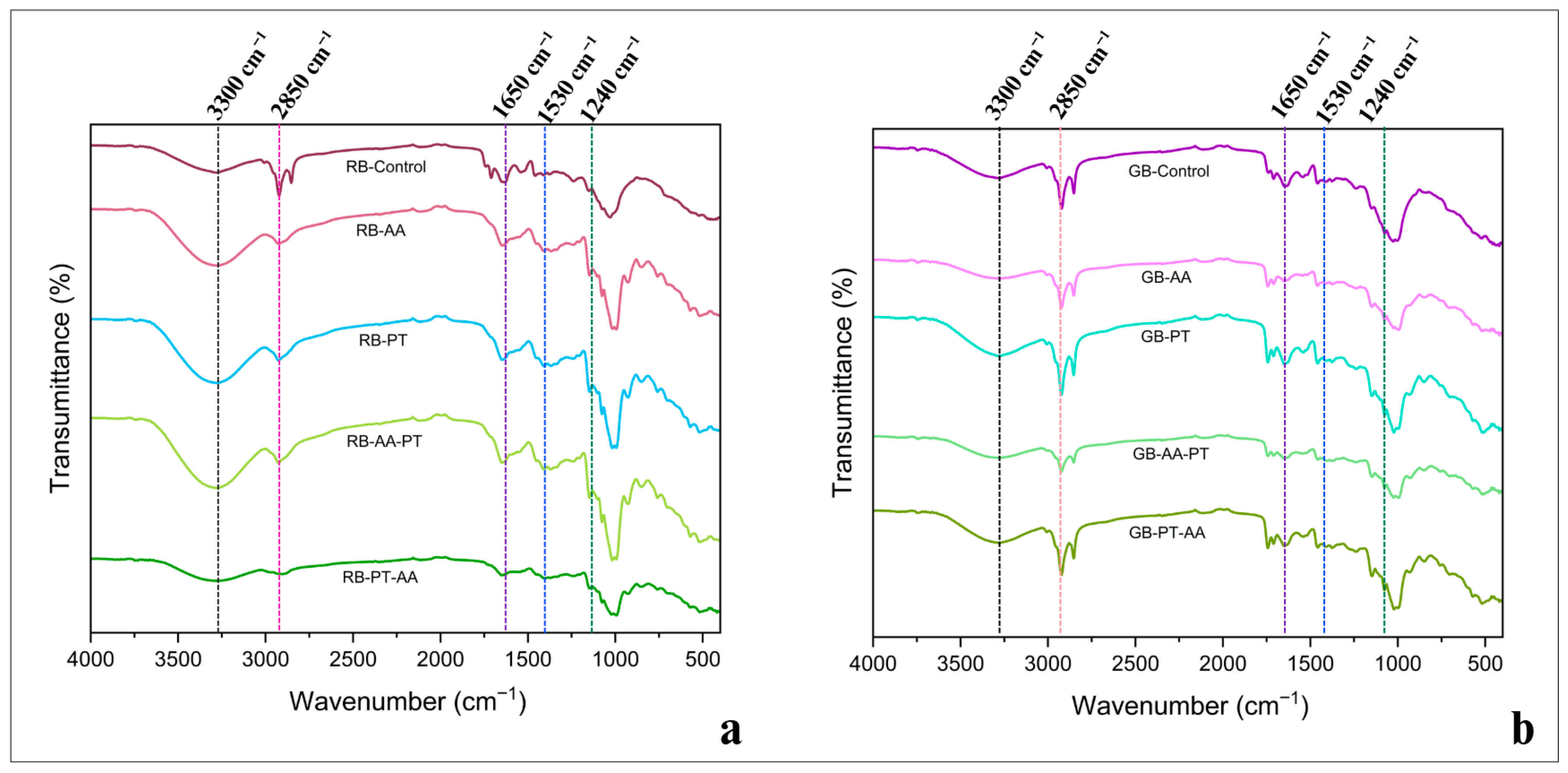 | PT-AA | 67.55 ± 0.02 b | 1.35 ± 0.05 d | 20.31 ± 0.02 a | 0.48 ± 0.50 | 1.14 ± 0.02 f | |