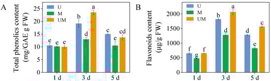 Effect of exogenous MT on total phenolics content (A) and flavonoids content (B) in buckwheat sprouts under UV-B stress. Different lowercase letters indicate significant differences between groups (p < 0.05). U: 8 h UV-B irradiation. M: 30 μM MT. UM: 8 h UV-B irradiation combined with 30 μM MT treatment. n = 3 biological replicates.