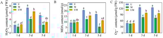 contents among treatments on the first day (Figure 2, p > 0.05). Compared with UV-B stress, exogenous MT treatment significantly reduced H2O2, MDA, and