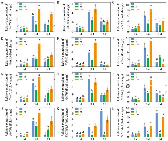 Effects of exogenous MT on relative gene expression levels ((A): FeAPX, (B): FeCAT, (C): FePOD, (D): FeSOD, (E): FePAL, (F): FeC4H, (G): Fe4CL, (H): FeCHS, (I): FeCHI, (J): FeF3H, (K): FeTOP15, and (L): FeMYB11) in buckwheat sprouts under UV-B stress. Relative expression levels of each gene in buckwheat sprouts germinated for 1 day under UV-B treatment were used as the control, with their values set to 1.0. n = 3 biological replicates. Different lowercase letters indicate significant differences between groups (p < 0.05).