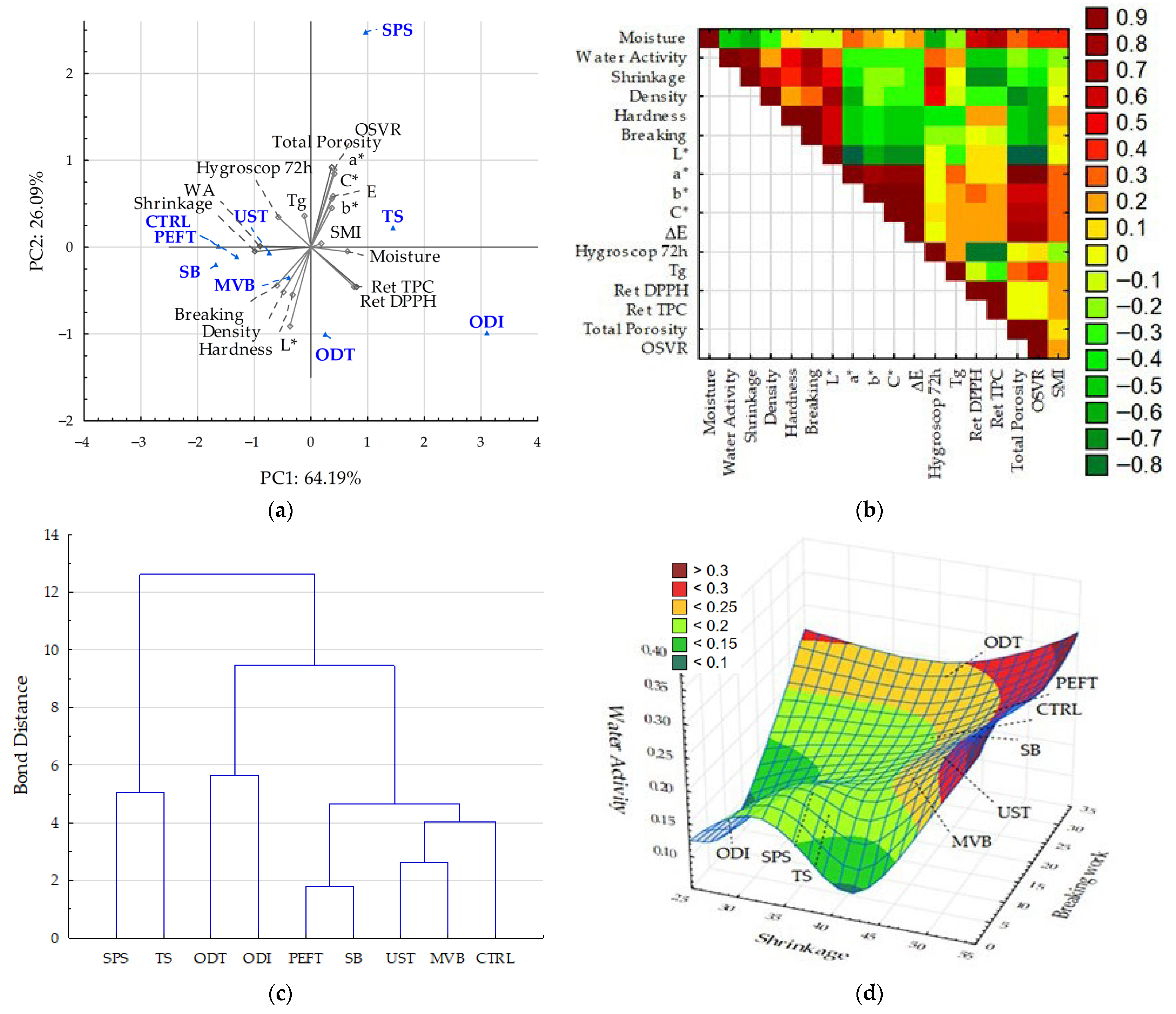 | Sample | Water Activity | Moisture Content [%] | Shrinkage [%] | Density [g/cm3] | Hardness [N] | Breaking Work [mJ] |