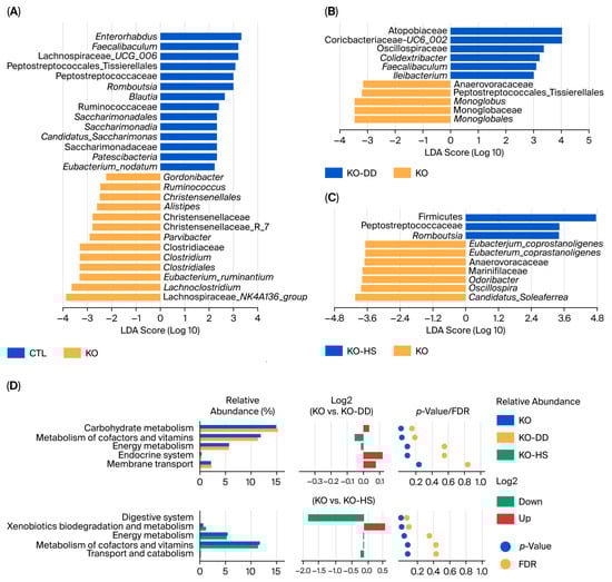 To further confirm the biomarkers, we performed linear discriminant analysis (LDA). The result showed that the marker microbiota of the CTL group were Enterorhabdus, Faecalibaculum, Romboutsia, and Blautia. The marker microbiota in the KO group were Lachnoclostridium, Eubacterium_ruminantium, Clostridiales, and Clostridium (Figure 3A). Meanwhile, the marker microbiota of the KO-DD group were Clostridiaceae, Atopobiaceae, Oscillospiraceae, and Ruminococcaceae (Figure 3B). The significantly different microbiota in the KO-HS group were Romboutsia, Odoribacter, and Oscillospira (Figure 3C). These results show that CVS treatment leads to significant changes in gut differential microbiota, and different CVS treatments regulate different marker microbiota. In terms of the effect of CVS on the gut microbial function of mice, the function was predicted using PICRUST2 software (version 2.3). The results showed that the pathways predicted for the intestinal microbial function of mice in the KO-HS group included cofactor and vitamin metabolism, energy circulation, and other amino acid metabolism (Figure 3D). The pathways predicted in the KO-HS group included the digestive system, xenobiotics biodegradation and metabolism, and energy metabolism (Figure 3D). The above results indicate that organic acids in CVS may help digest and absorb nutrients in food, enhance energy metabolism, and reduce fat accumulation. However, it is worth noting that functional predictions were performed for exploratory purposes and may not fully reflect in vivo microbial functions.
