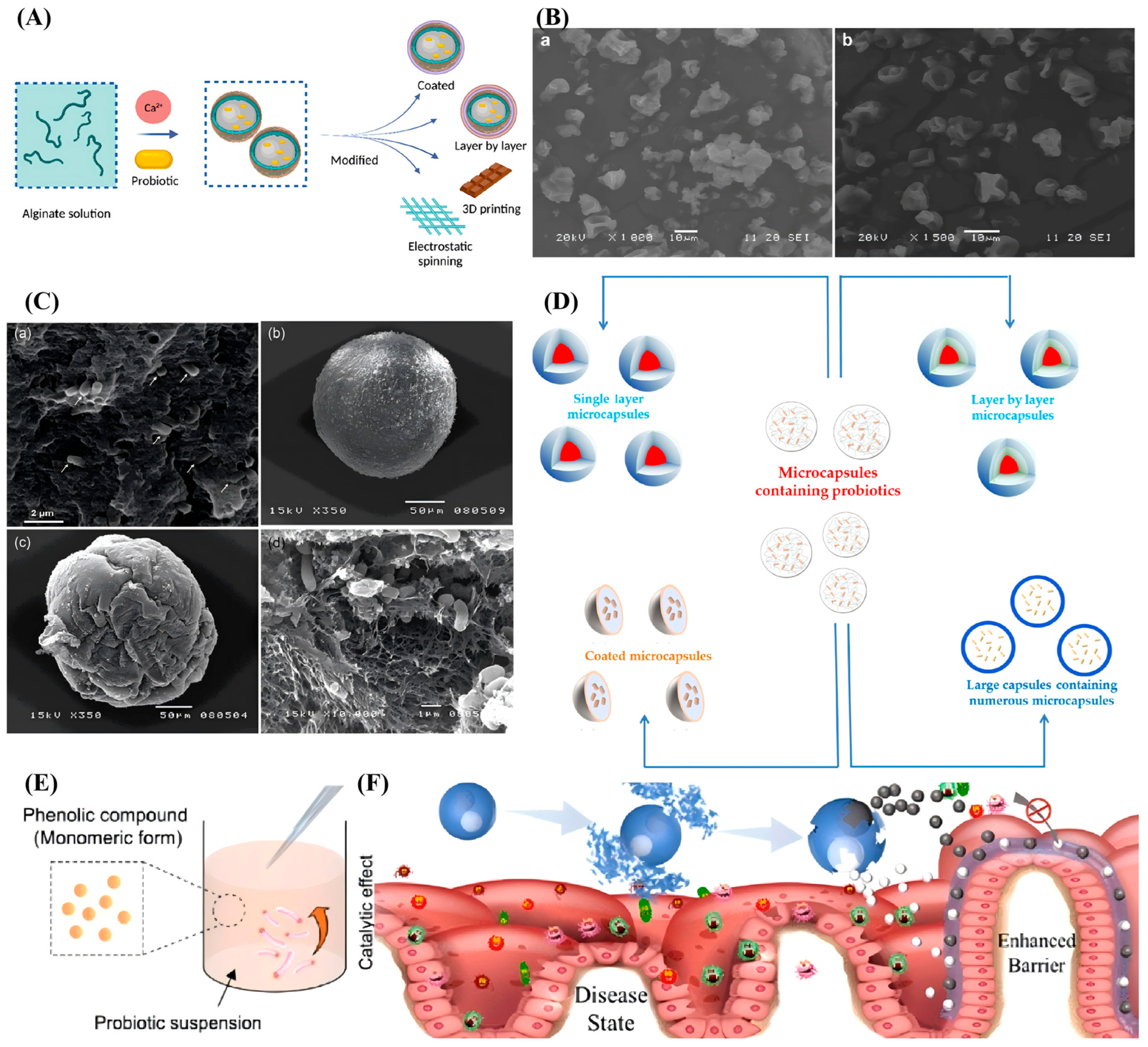 - Yuan, Y.; Yin, M.; Zhai, Q.; Chen, M. The encapsulation strategy to improve the survival of probiotics for food application: From rough multicellular to single-cell surface engineering and microbial mediation. Crit. Rev. Food Sci. Nutr. 2024, 64, 2794–2810. [Google Scholar] [CrossRef]