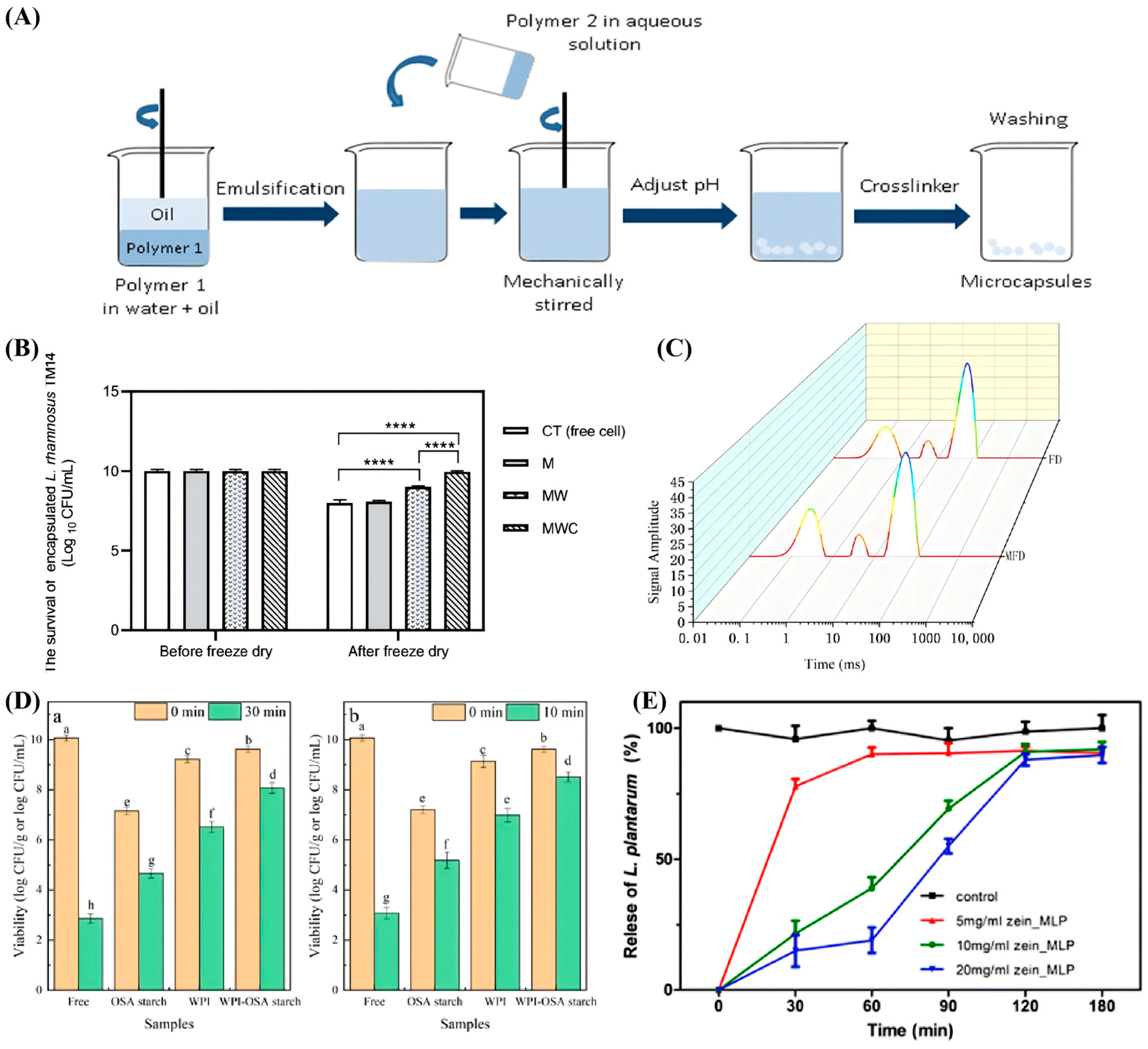 - Chen, Y.; Zhang, W.; Wang, W. Stability of probiotic microcapsules produced through complex coacervation based on whey protein-gum arabic coupled with double emulsification: Role of krill oil in middle oil phase. Int. J. Biol. Macromol. 2025, 298, 139982. [Google Scholar] [CrossRef] [PubMed]