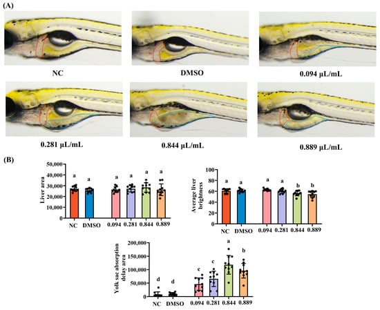 Hepatotoxicity was examined in wild-type AB larvae using the same six treatment groups and group sizes as in Section 2.3. Larvae were exposed to 2-acetylfuran for 2 days. After exposure, 10 larvae per group were randomly selected and observed under a dissecting microscope. Liver morphology was documented, and quantitative analysis of liver area, mean liver brightness (as a proxy for hepatocellular integrity), and yolk sac residual area was performed using image analysis software. These parameters were collectively used to characterize hepatotoxic changes.
