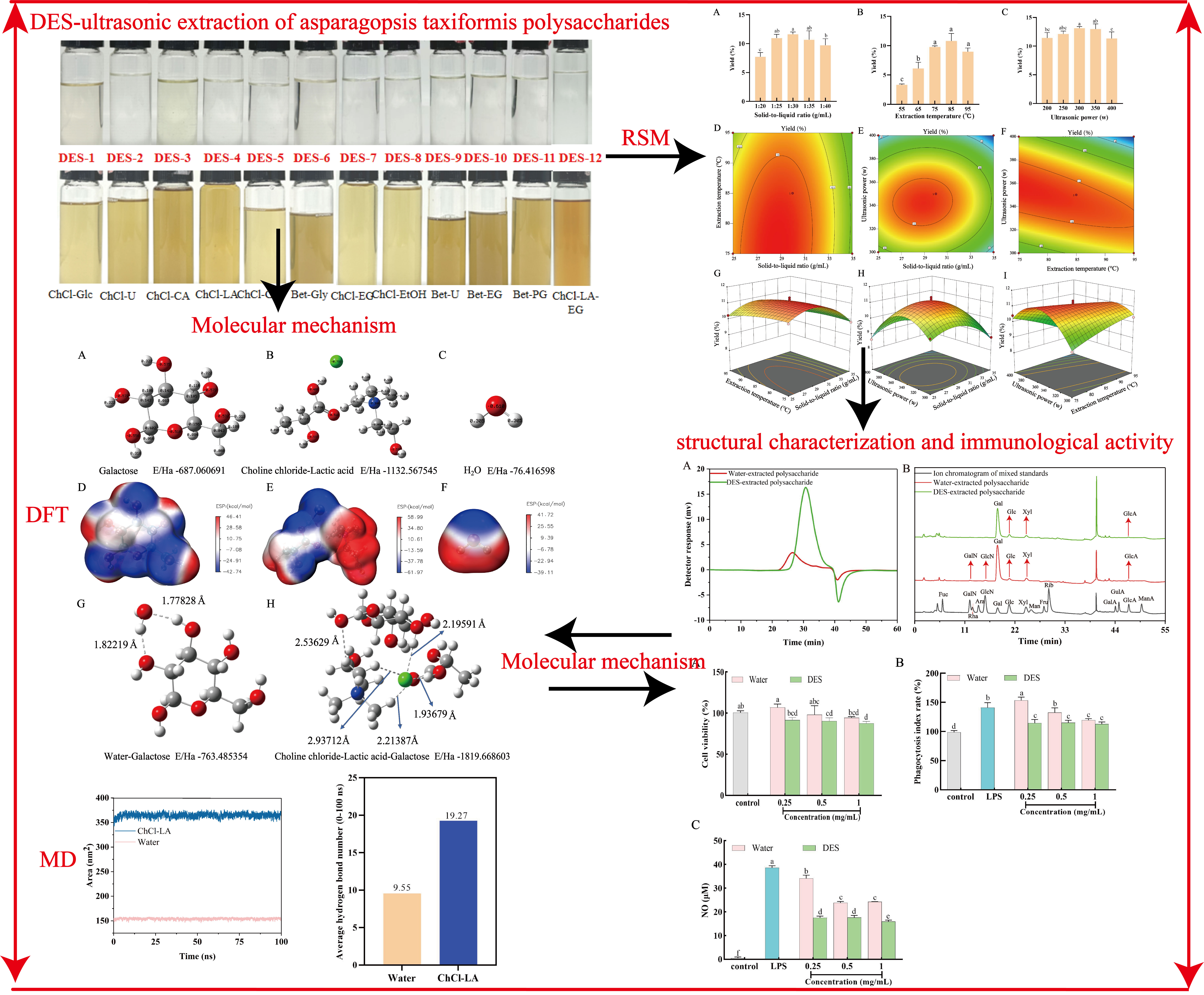 Figure 4G). Studies have shown that hydrogen bonds play a crucial role in the formation of DESs and their solvation processes. The enhanced extraction efficiency of polysaccharides using DESs can be attributed to the formation of hydrogen bonds between galactose molecules and DES molecules; this interaction enhances the solubility of galactose in DES systems [