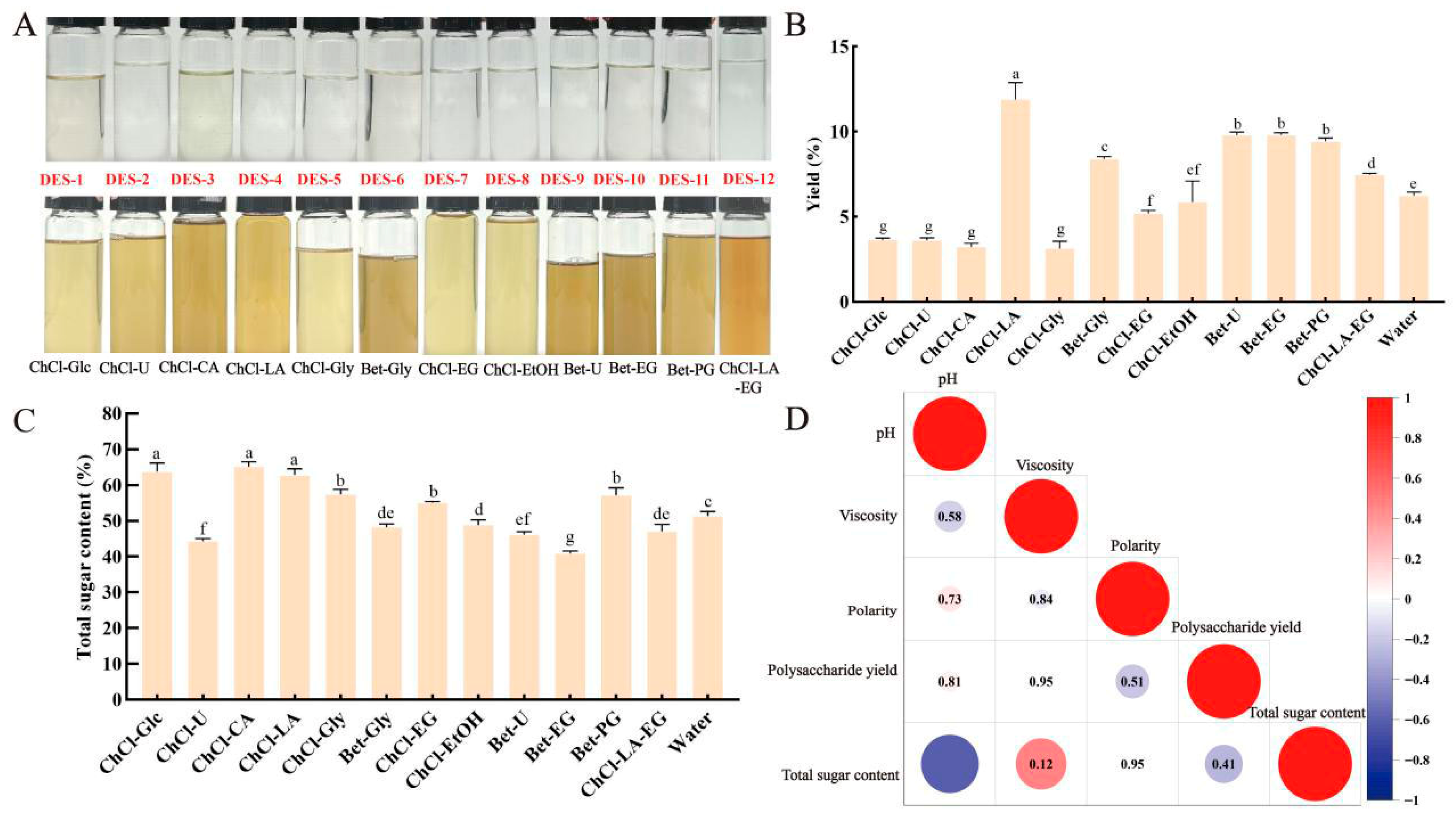 Figure 1D illustrates the correlations between the physicochemical properties of 12 DESs and polysaccharide yield as well as total sugar content. In this study, we found that polysaccharide yield is positively correlated with pH (r = 0.81), negatively correlated with polarity (r = −0.51), and exhibits an extremely weak correlation with viscosity (indicated by the nearly white color in the plot). Additionally, total sugar content is negatively correlated with pH (r = −0.8, shown as dark blue), while its correlations with viscosity (r = 0.12) and polarity are relatively weak (indicated by the nearly white color). These results indicate that the pH of the solvent is a core factor affecting both polysaccharide yield and total sugar content: an appropriate pH can not only enhance polysaccharide yield through a weakly alkaline environment but also prevent a decrease in total sugar content caused by excessively high pH; in contrast, overly acidic or alkaline conditions may induce polysaccharide degradation (e.g., glycosidic bond cleavage) or elution of impurities, which not only reduce the efficiency of polysaccharide extraction but also dilute the proportion of total sugar [