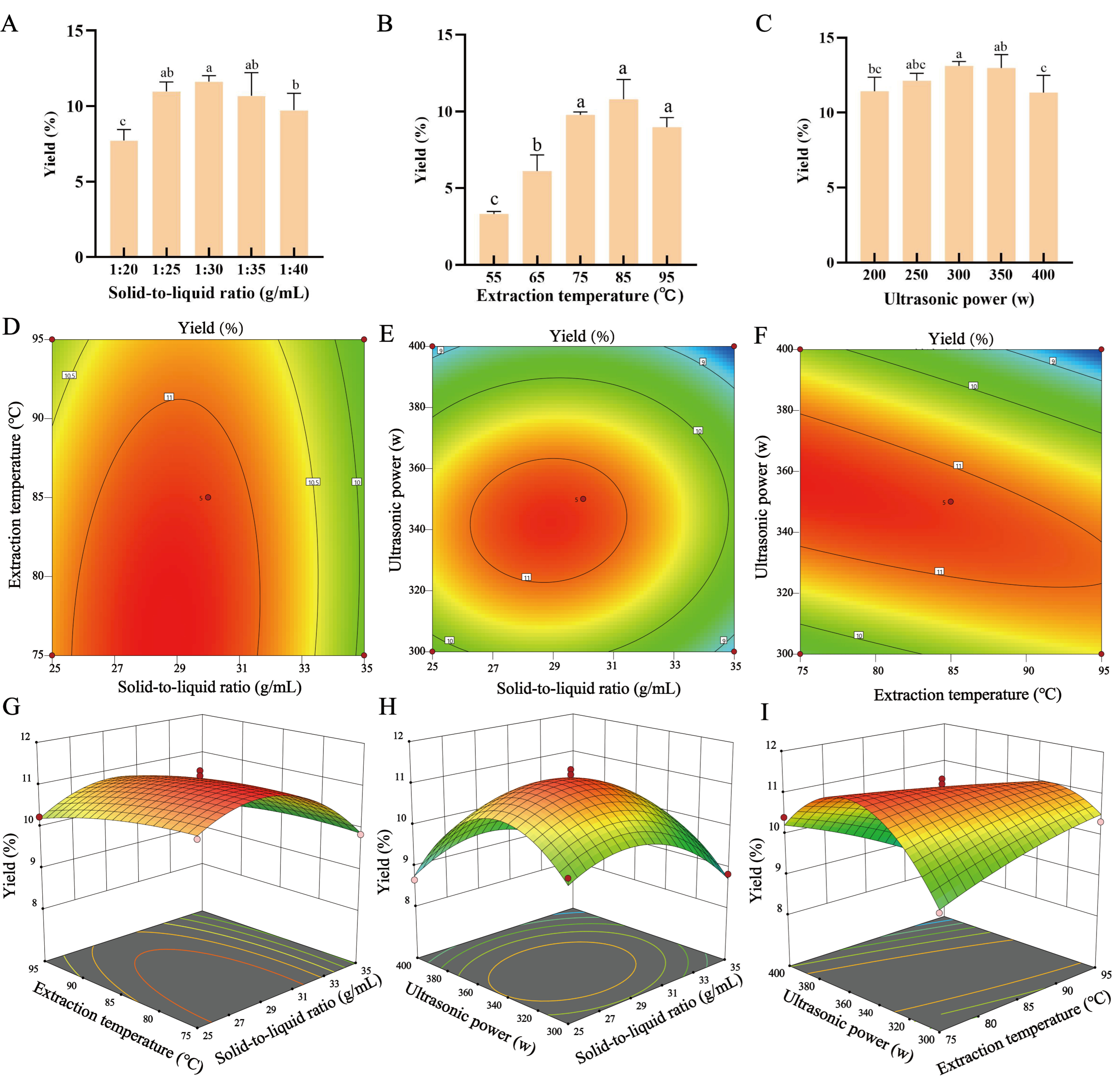 2). This indicates that the response surface curves corresponding to liquid-to-solid ratio and ultrasonic power present a convex shape, a key feature confirming the existence of a maximum yield point, which provides theoretical support for identifying the optimal extraction conditions. The model exhibited a