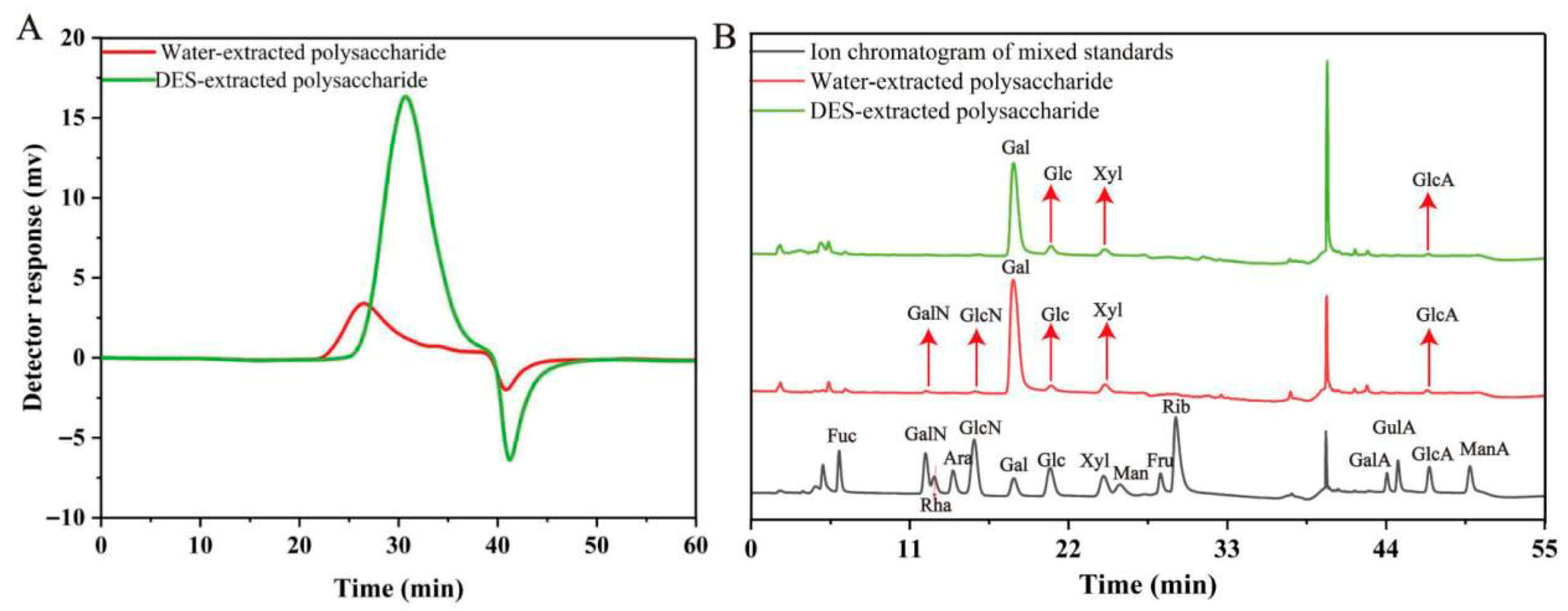 Figure 3A) show that the weight-average molecular weight (Mw) of the hot water-extracted polysaccharides was 812.53 kDa, with a polydispersity index of 1.017; in contrast, the Mw of the DES-extracted polysaccharides was 99.88 kDa, with a polydispersity index (PDI) of 1.027. The PDI is a key parameter characterizing the uniformity of polysaccharide molecular weight distribution: the smaller the ratio (Mw/Mn) (closer to 1), the more uniform the molecular weight distribution of the sample [