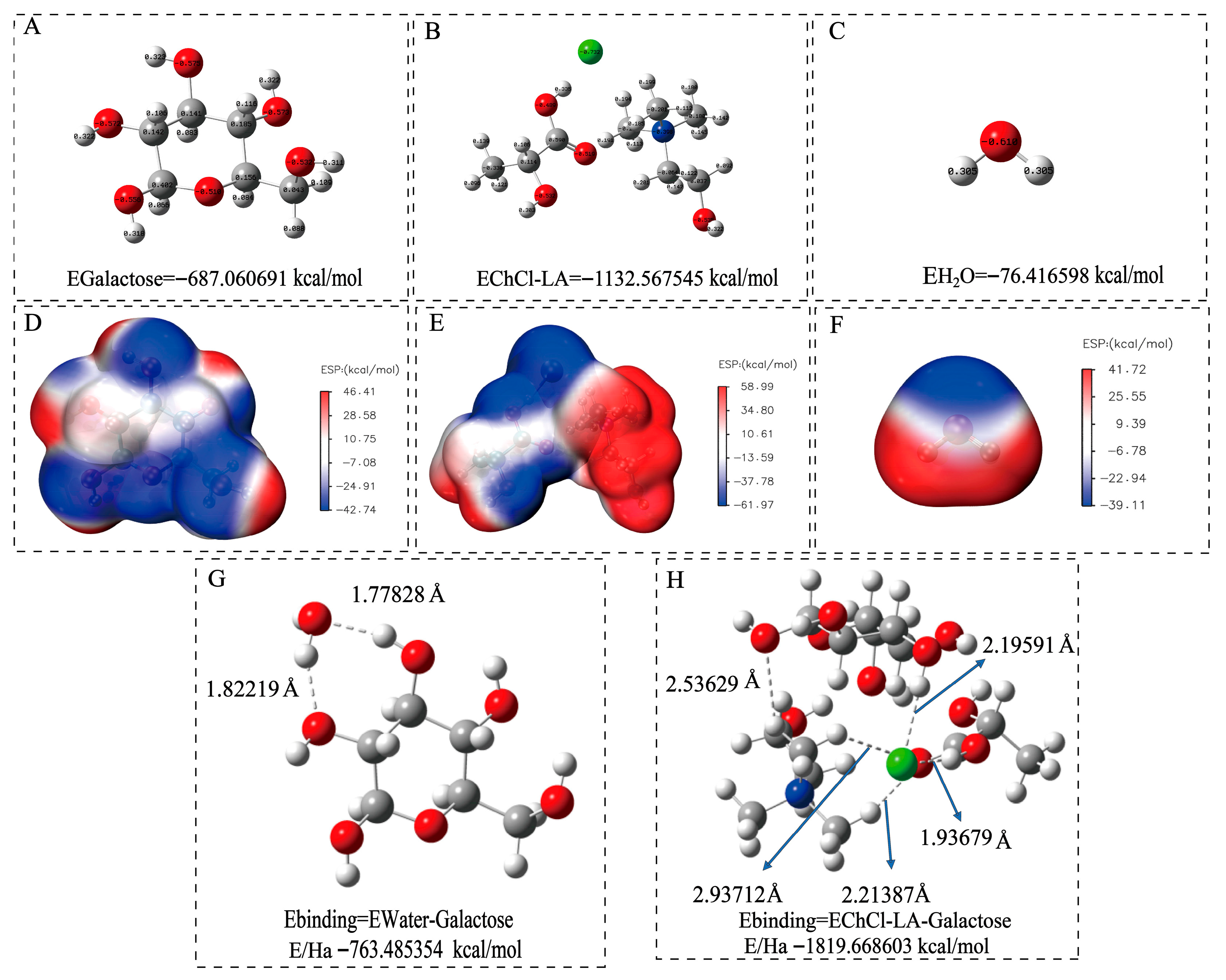 Figure 4G–H. Meanwhile, the oxygen atom of a water molecule forms a hydrogen bond with the hydroxyl hydrogen atom of another site on galactose, with a binding energy of −5.06 kcal/mol for this interaction. Likewise, the chlorine atom of choline chloride forms a hydrogen bond with the hydroxyl hydrogen of galactose, and the hydrogen atoms of choline chloride form hydrogen bonds with the hydroxyl oxygen atoms of galactose. Additionally, the chlorine atom of choline chloride forms a hydrogen bond with the hydrogen atom of lactic acid, and the hydrogen atoms of choline chloride form hydrogen bonds with the double-bond oxygen atoms of lactic acid; the binding energy for the interaction between ChCl-LA and galactose is −25.33 kcal/mol.