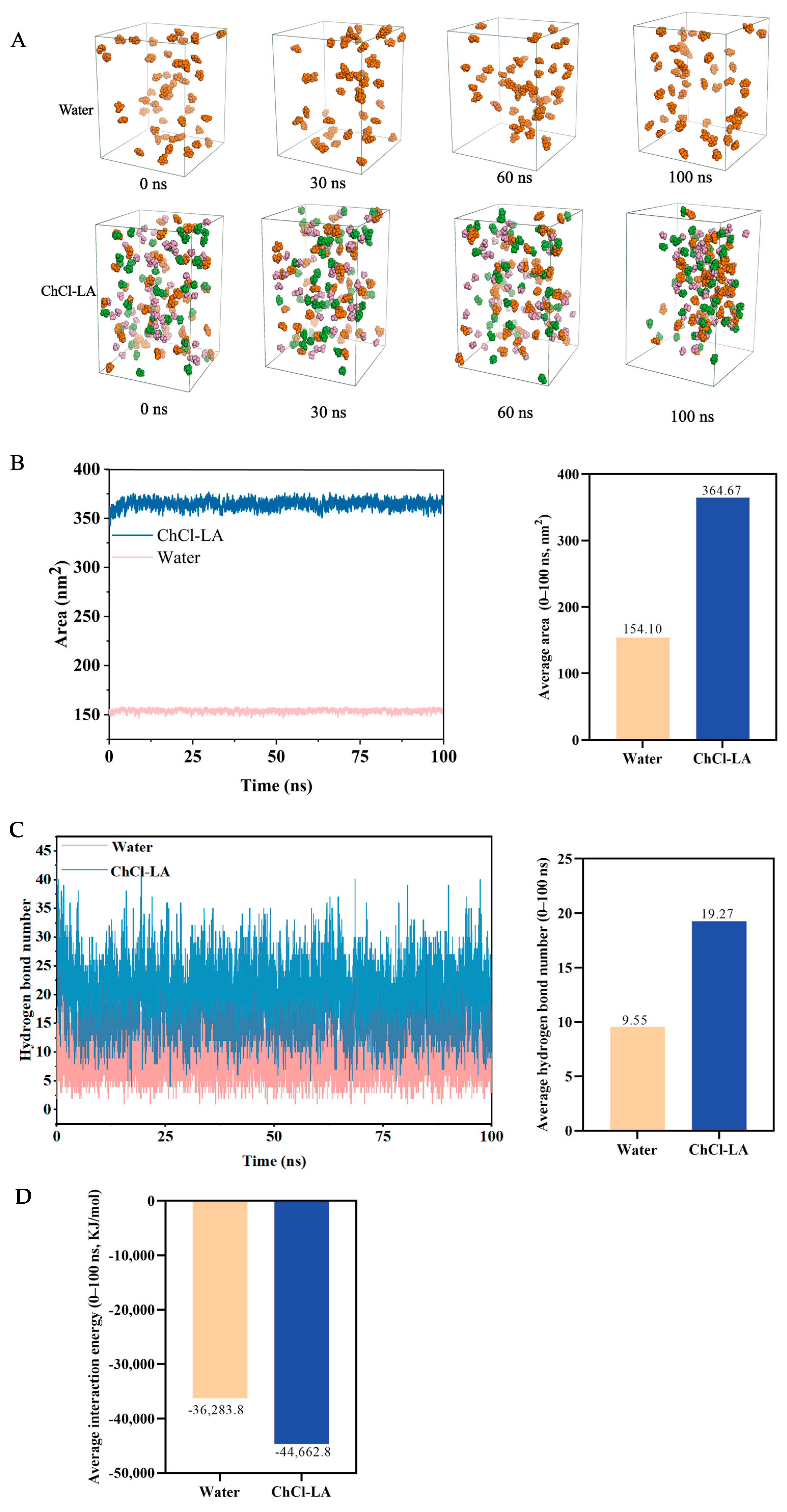 Figure 5C shows the variations in the number of hydrogen bonds formed between galactose and solvents in both water and ChCl-LA systems. Within 0–100 ns, the number of hydrogen bonds formed between galactose and ChCl-LA is significantly higher than that between galactose and water. The average number of hydrogen bonds formed between galactose and ChCl-LA is 19.27, which is twice that formed between galactose and water. The smaller number of hydrogen bonds in the water system reflects the limited binding capacity between components in a single-component solvent. In contrast, in the mixed solvent system, more diverse hydrogen bond networks are formed among galactose, lactic acid, choline cations, and chloride ions. This indicates that the continuous formation and breaking of hydrogen bond networks among these components is an important manifestation of the driving force for their aggregation, which is consistent with the conclusions from DFT calculations. Additionally, the binding energy results further clarify the molecular interactions between solute and solvent (