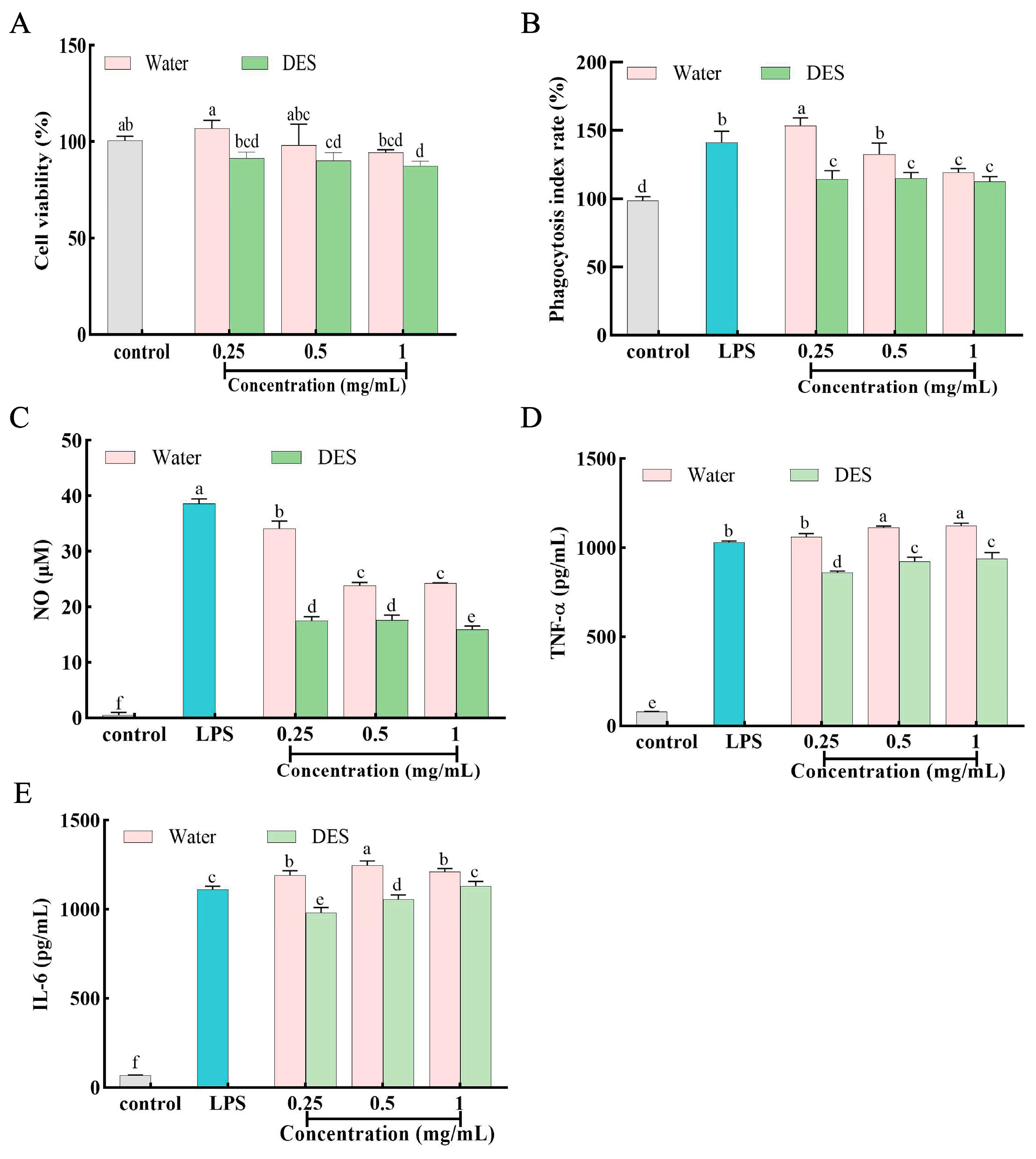 Figure 6B), indicating that polysaccharides extracted by both hot water and DES extraction methods can effectively promote the phagocytic function of macrophages (