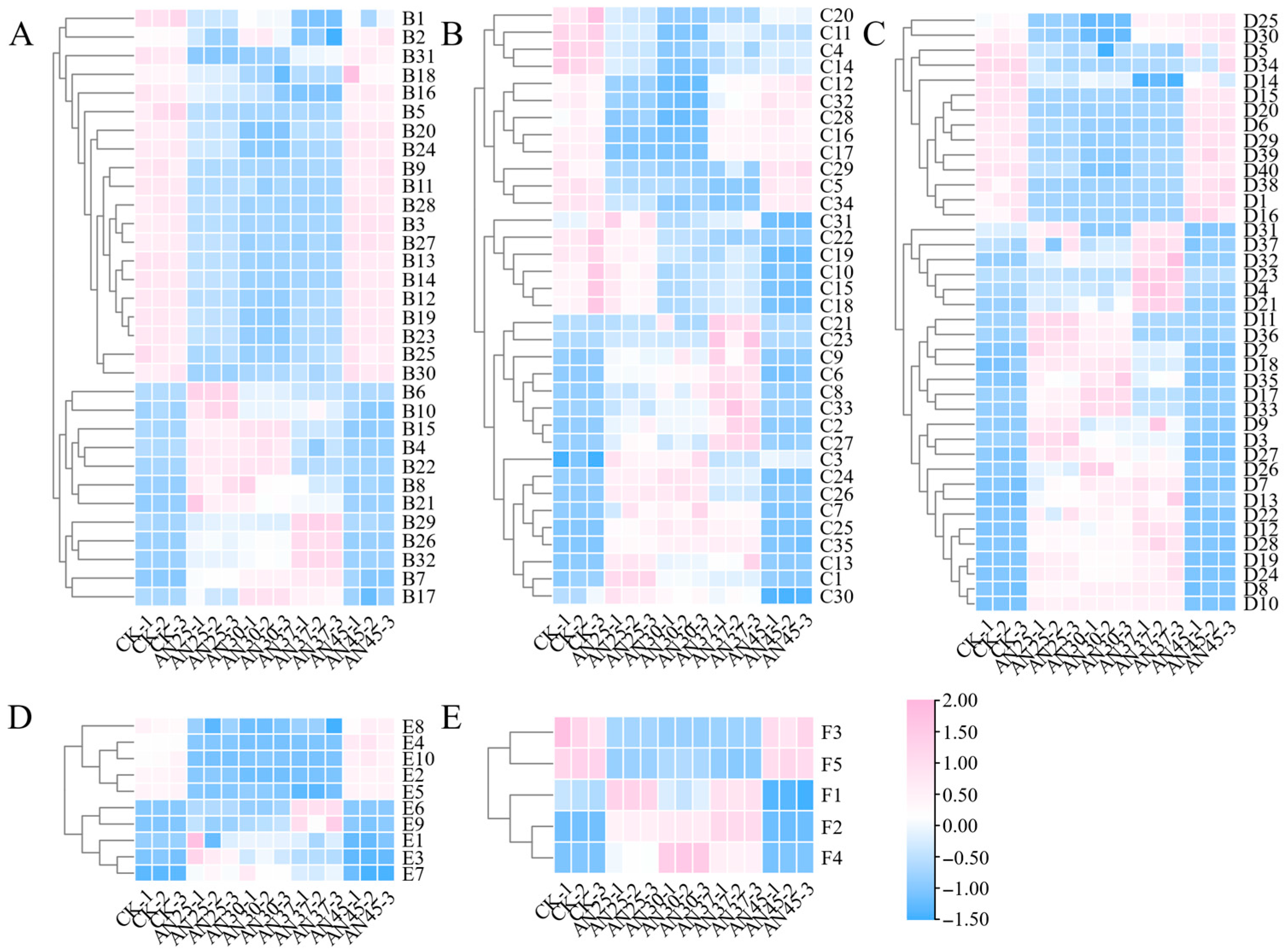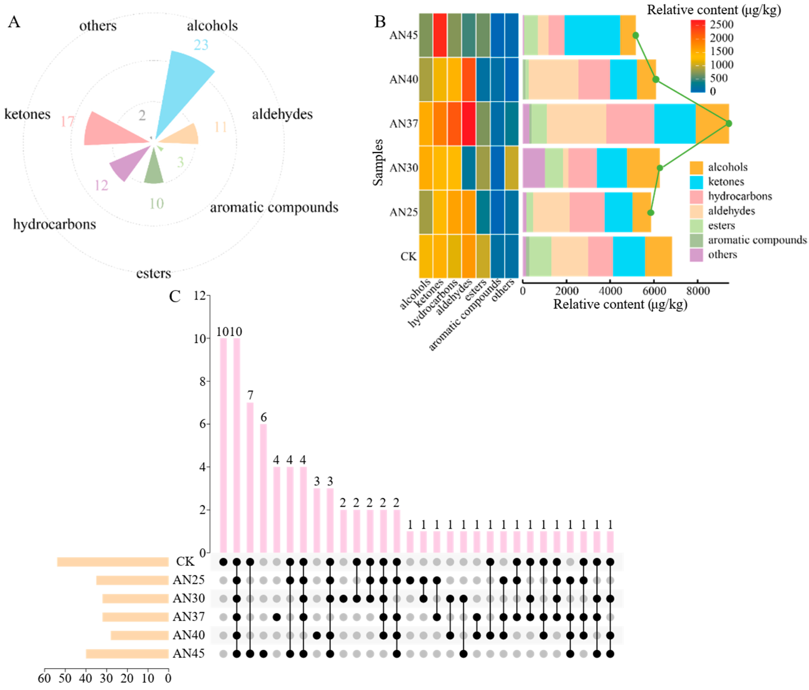 3.3. Inoculation with AN at Different Fermentation Temperatures Impacts the Composition of Volatile Compounds in Dark Tea