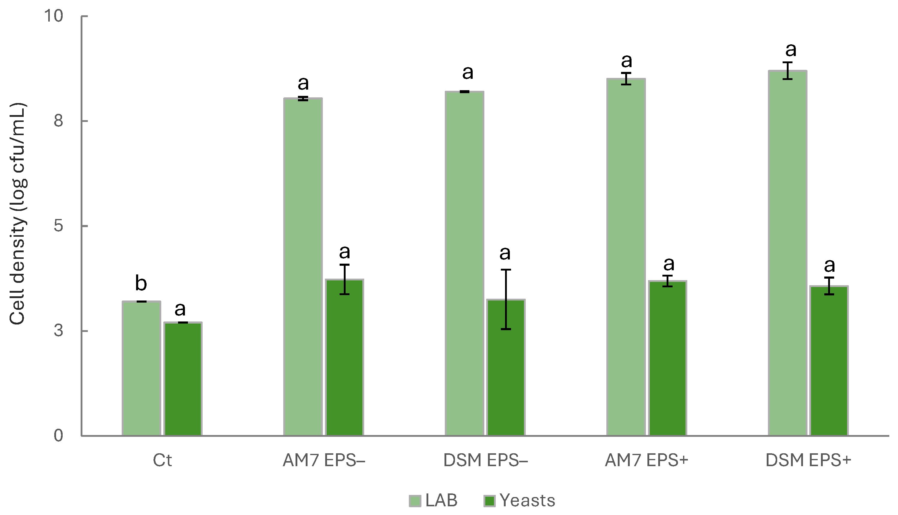 - Hernández-Figueroa, R.H.; López-Malo, A.; Mani-López, E. Lactic acid bacteria-derived exopolysaccharides: Dual roles as functional ingredients and fermentation agents in food applications. Fermentation 2025, 11, 538. [Google Scholar] [CrossRef]