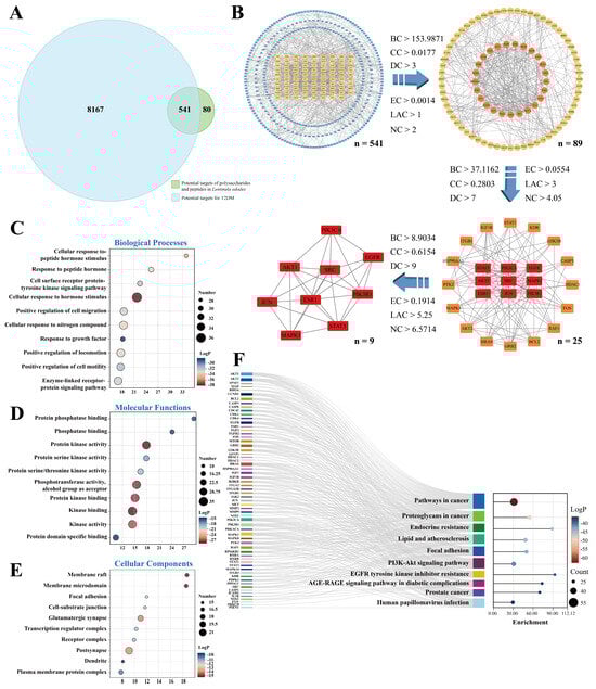 Network pharmacology analysis for the mechanism of L. edodes peptides and polysaccharides in treating T2DM. (A) Venn diagram showing the intersection of target proteins for L. edodes peptides and polysaccharides with T2DM disease targets. Among the 621 L. edodes peptide- and polysaccharide-related targets screened from databases and the 8707 T2DM-related targets, 541 common targets were identified. (B) Screening process and criteria for identifying core targets in the interaction network between L. edodes peptides/polysaccharides and T2DM. (C–E): Gene Ontology (GO) enrichment analysis of L. edodes peptides and polysaccharides for potential targets against T2DM. (F): KEGG enrichment analysis of potential anti-T2DM targets for L. edodes peptides and polysaccharides.