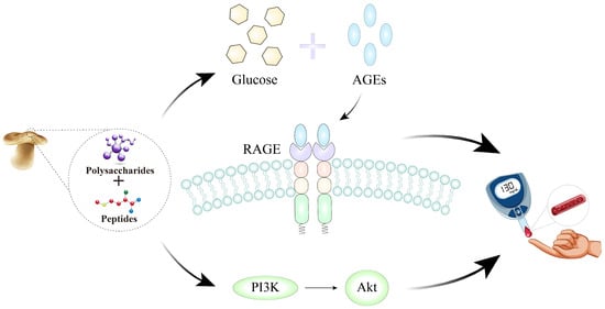 Possible mechanisms of L. edodes peptides and polysaccharides in improving T2DM complications via the PI3K-Akt signaling pathway and the AGE-RAGE signaling pathway in diabetic complications.