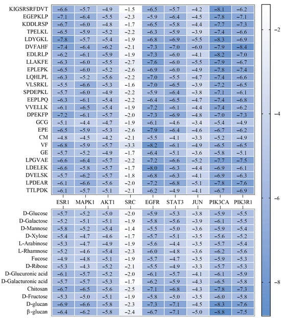Binding affinity between L. edodes peptides and polysaccharides (vertical axis) with core target proteins (horizontal axis). Color intensity corresponds to binding energy scores (kcal/mol), ranging from −1.4 (weak binding, white) to −8.8 (strong binding, blue).