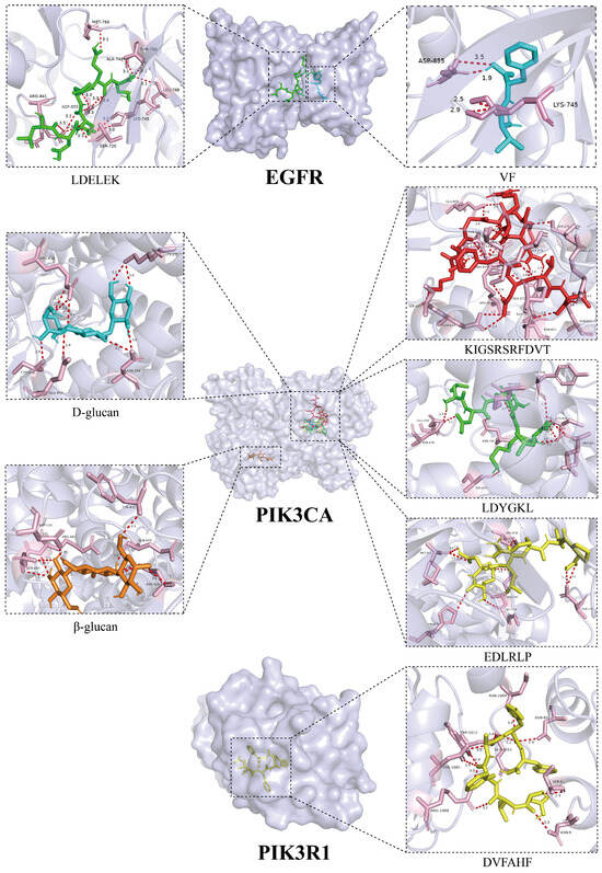 Binding modes of peptides VF and LDELEK with EGFR; binding modes of peptides KIGSRSRFDVT, LDYGKL, and EDLRLP, as well as polysaccharides D-glucan and β-glucan, with PIK3CA; binding mode of peptide DVFAHF with PIK3R1 (The light purple regions indicate target proteins, while the pink regions represent amino acid residues within the target proteins that interact with ligands (L. edodes peptides and polysaccharides). Ligands are displayed in multiple colors: green, blue, red, orange, and yellow structures represent different polysaccharides or peptides, respectively. The red dashed lines in the figure indicate hydrogen bond interactions formed between ligands and target residues).