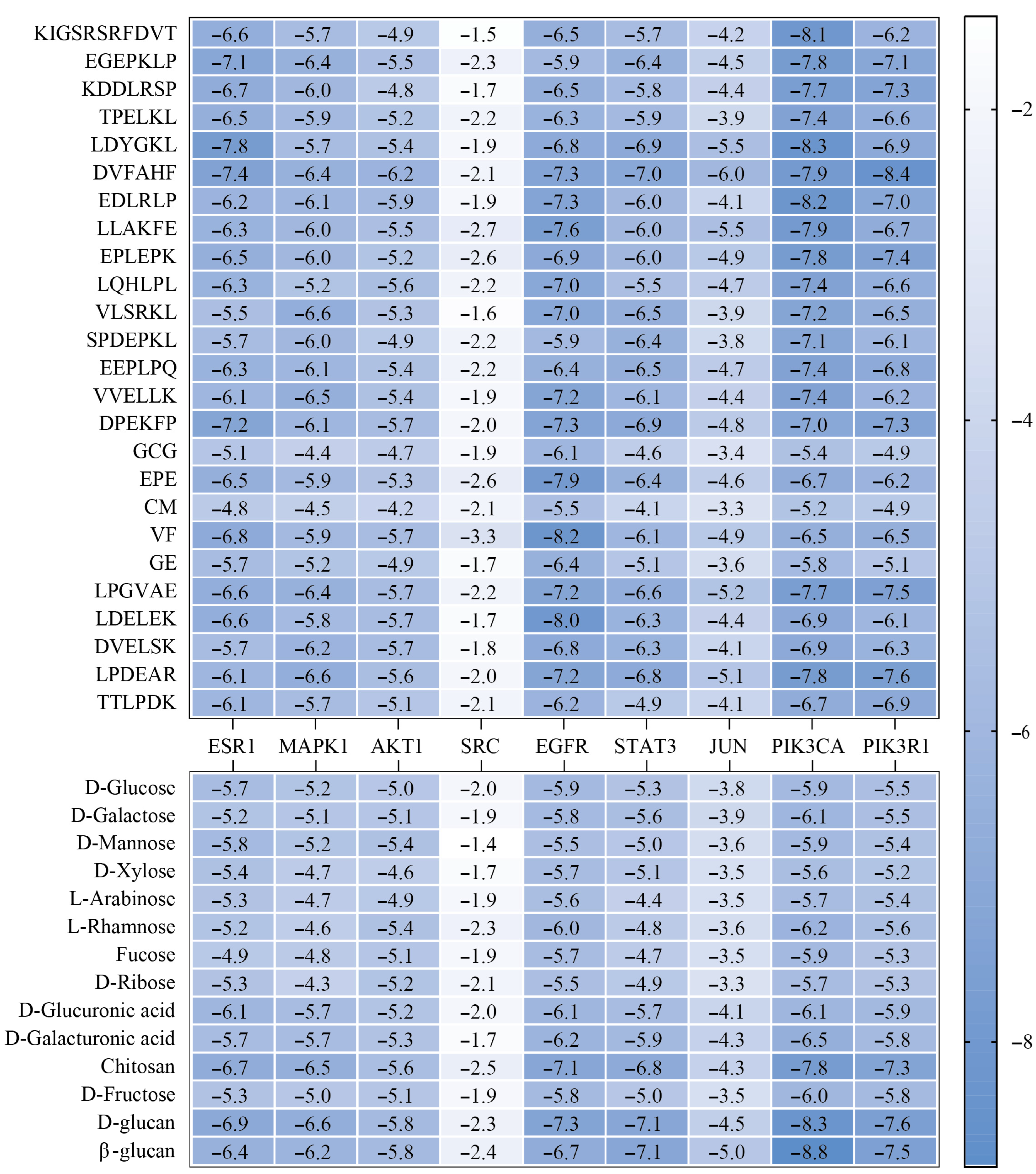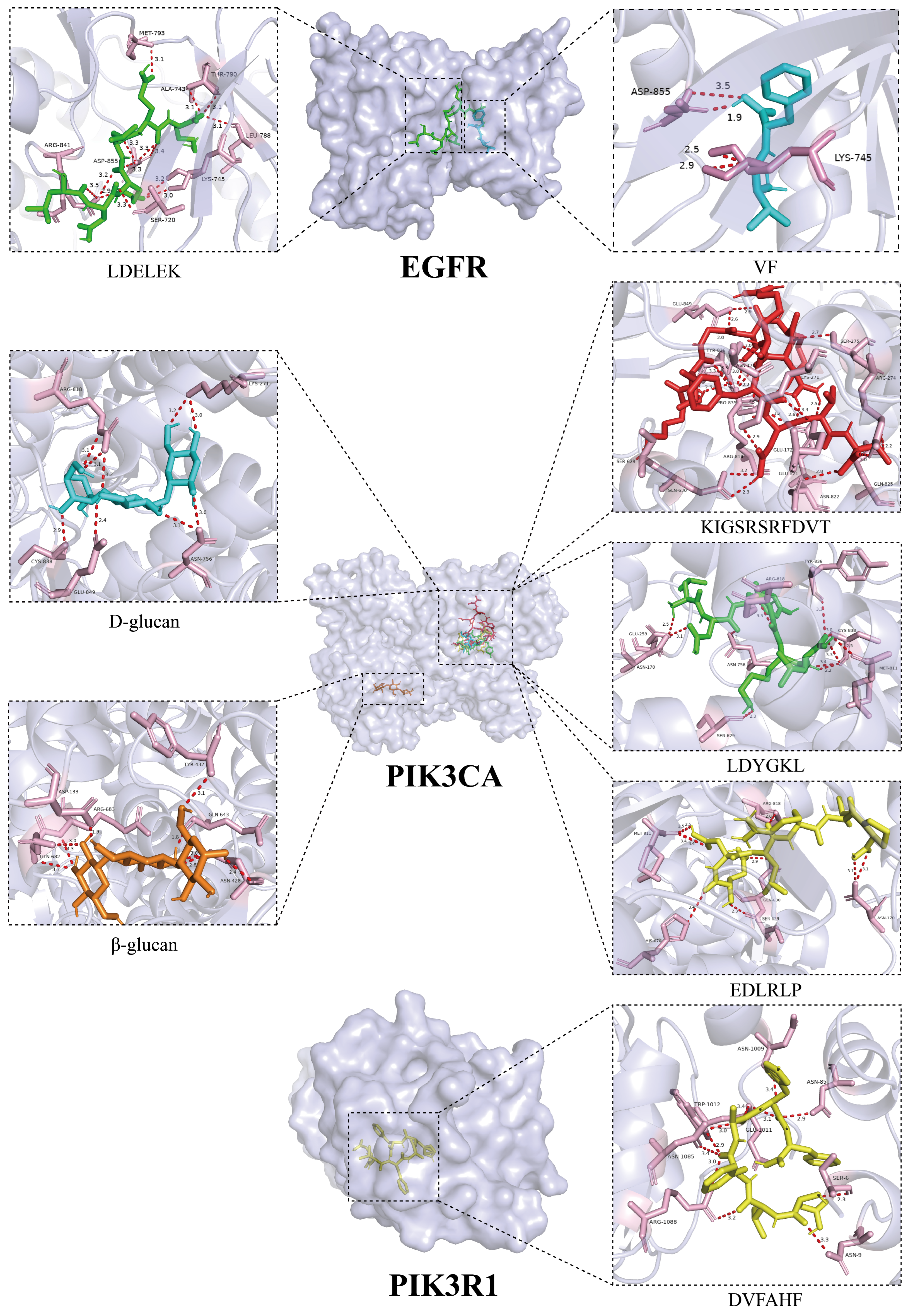 3.6. Molecular Docking of L. edodes Peptides and Polysaccharides with Target Molecules