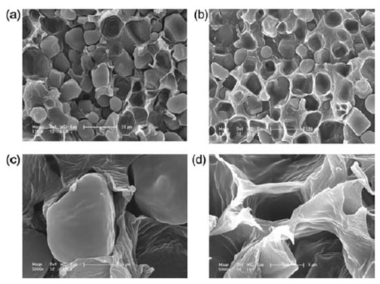 Despite these efforts, conventional blending or additive-based approaches often lead to only limited improvements in interfacial adhesion and mechanical properties. In contrast, reactive compatibilization strategies, where functional copolymers are generated in situ during melt processing, have shown superior effectiveness in enhancing phase dispersion and interfacial cohesion. Figure 2 illustrates the morphological evolution of PLA/starch composites before and after the introduction of a compatibilizer, specifically starch grafted with poly(L-lactic acid) (St-g-PLLA), as revealed by scanning electron microscopy (SEM) [70]. In the unmodified blend, distinct phase separation is evident, with clear boundaries between starch granules and the surrounding PLA matrix (Figure 2a,c), indicating poor interfacial adhesion. In contrast, the addition of St-g-PLLA results in a smoother and more integrated interface with significantly reduced interfacial voids (Figure 2b,d). This morphological improvement confirms that the compatibilizer effectively promotes molecular-level interactions at the interface, leading to enhanced miscibility and improved interfacial bonding. Smaller or more regularly shaped granules generally promote improved dispersion and stress transfer, whereas larger or irregular starch granules may induce stress concentration, interfacial voids, and preferential water pathways, thereby influencing mechanical performance, barrier properties, and controlled-release behavior. Importantly, while interfacial incompatibility is traditionally regarded as a drawback, the resulting phase-separated morphology can also be deliberately exploited to create water-responsive transport pathways, forming the structural basis for the controlled-release functions discussed in subsequent sections.