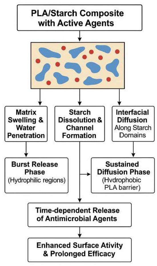 Schematic representation of controlled release mechanisms of antimicrobial agents in PLA/starch-based composite systems.