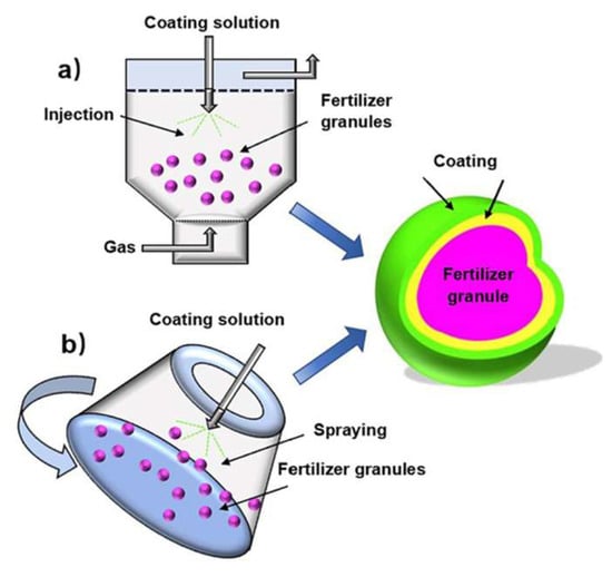 For highly water-soluble fertilizers such as urea, coating layers are designed to function as semipermeable barriers that delay water infiltration and regulate nutrient diffusion through osmotic- and capillary-driven mechanisms [166]. The release behavior is therefore governed not only by coating composition but also by environmental factors such as soil moisture, microbial activity, coating thickness, and temperature, which act synergistically to influence nutrient transport [161]. To accommodate large-scale production, commercial SRF manufacturing commonly employs pan coaters, rotary drum coaters, and fluidized bed coating systems [151], as schematically illustrated in Figure 8.
