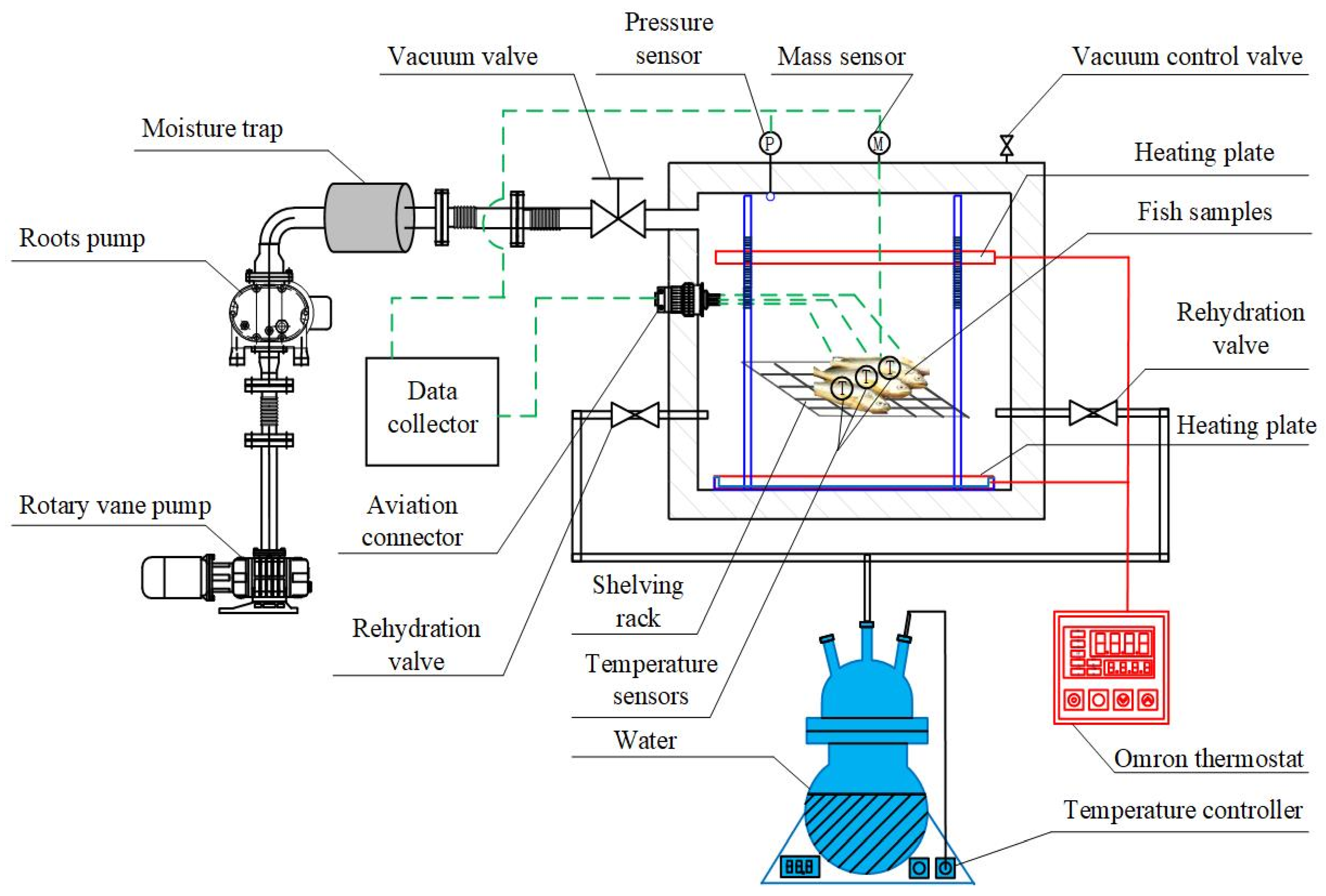 - Sun, Y.; Wu, W.; Xu, N.; Xue, A.; Su, M. Experimental study on the effect of symmetrical heat source on vacuum sublimation-rehydration thawing of large yellow croaker (Larimichthys crocea). Food Bioprod. Process. 2025, 153, 546–559. [Google Scholar] [CrossRef]