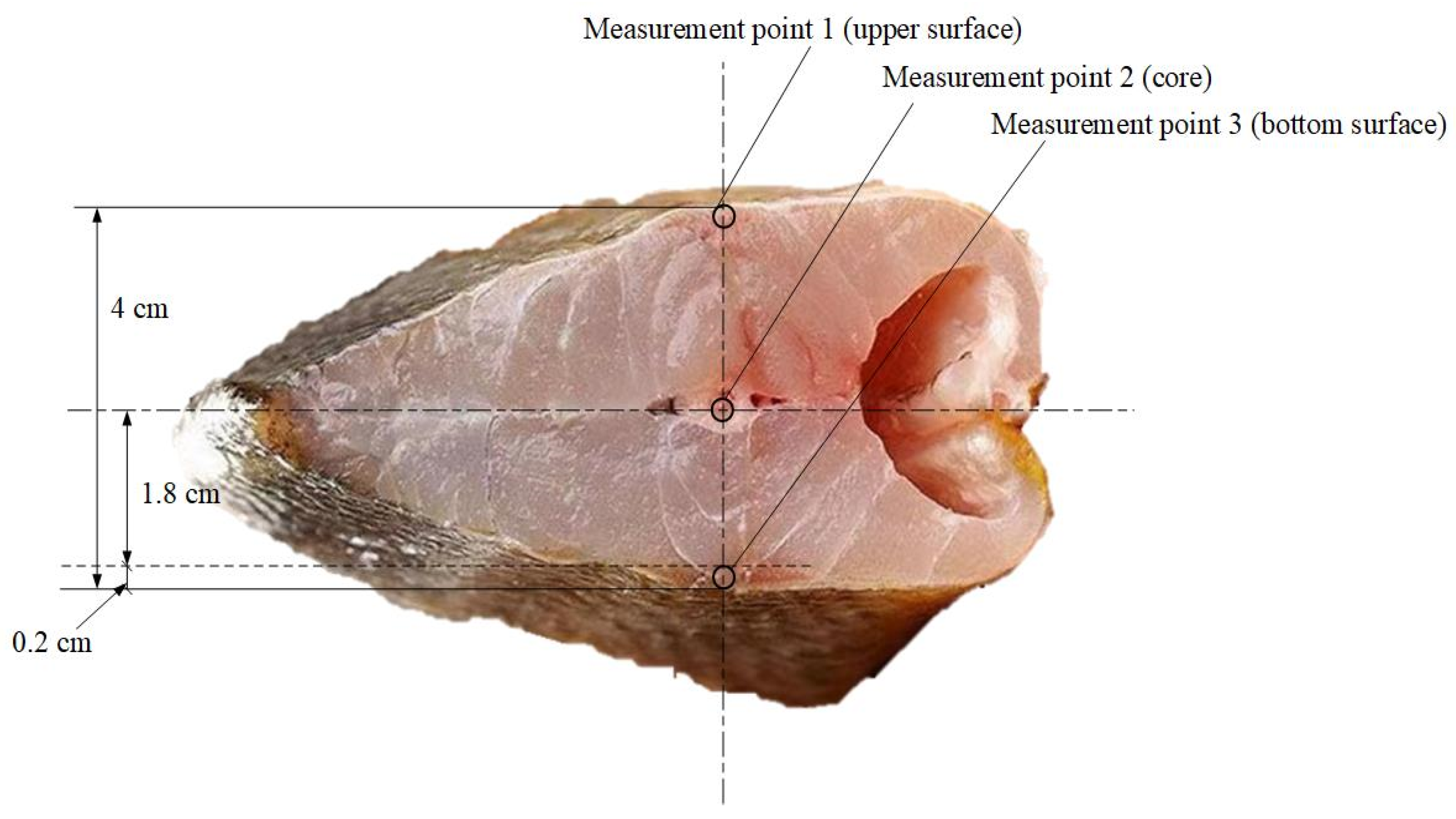 - As shown in Figure 2, thermocouples (with a diameter of 0.2 cm) were inserted at designated measurement points in fish samples, which were used to measure the upper surface temperature (insertion depth of 0.2 cm), core temperature (insertion depth of 2 cm) and bottom surface temperature (insertion depth of 0.2 cm) of fish samples.