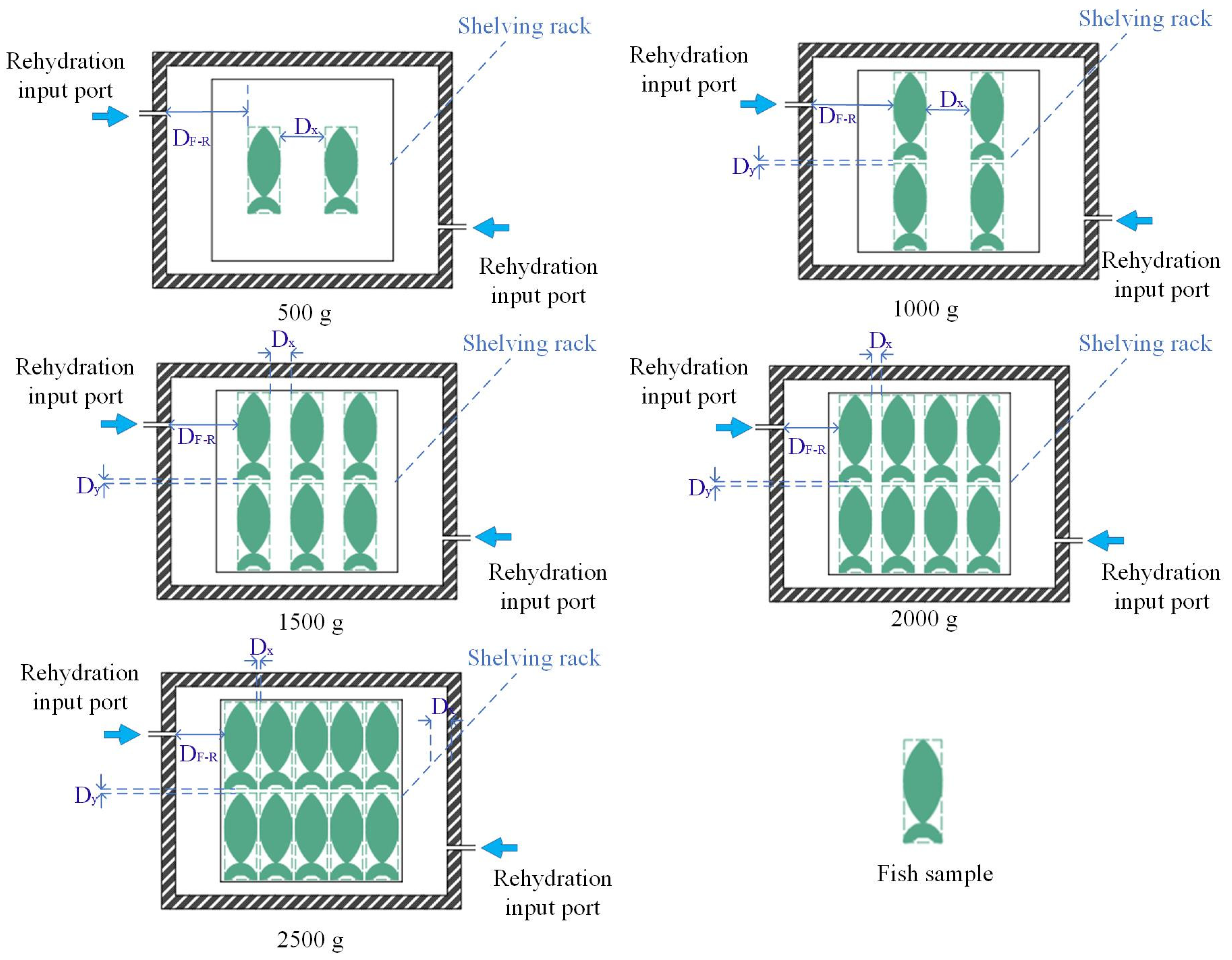 - Placement Form B: The fish samples were positioned closer to the rehydration input ports, and the widths of PWF-Fs were moderate. This placement form not only facilitated rapid vapor diffusion to fish samples, but also supported the most uniform condensation heat exchange. Thus, the thawing efficiency was the higher and the thawing uniformity was optimal.
