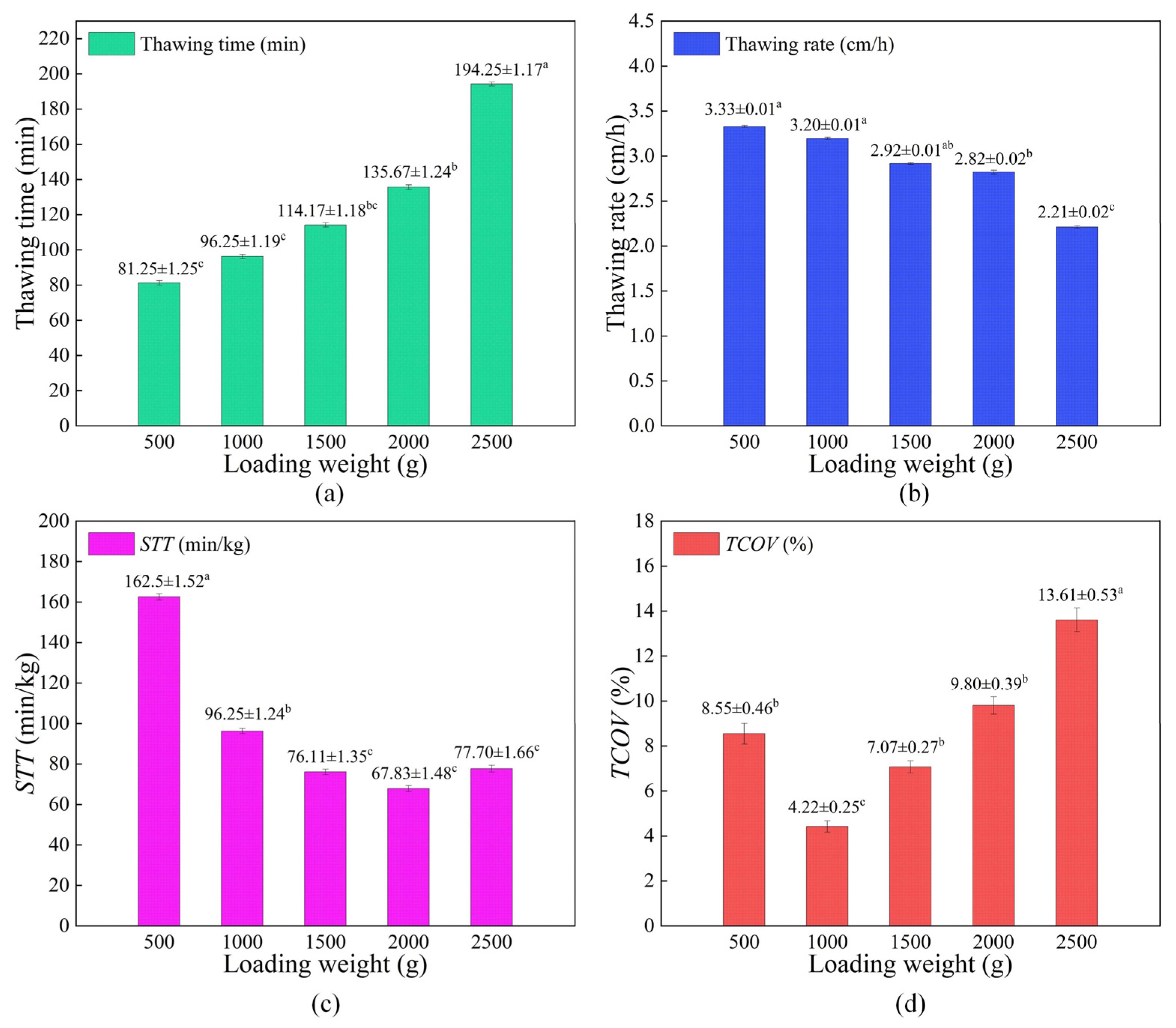 - The increase in loading weight resulted in a reduced ice crystal sublimation ratio and the alteration of pathways between adjacent fish samples, which was a key factor influencing vacuum sublimation–rehydration thawing. Based on the experimental system and operation conditions (with constant sublimation time of 20 min, constant DH-F of 80 mm, constant rehydration temperature of 35 °C, and constant heating plate temperature of 35 °C) in this paper, a loading weight of 1000 g (i.e., a loading ratio of 9.06 kg/m3) was determined to be optimal, resulting in the water vapor distribution that was most suitable for the operation conditions. This loading weight promoted efficient and uniform condensation heat exchange, which led to the highest thawing uniformity (lowest TCOV of 4.22%) and the best thawing effect (lowest thawing loss of 1.24%, highest moisture content of 73.33%, minimum ΔpH of +0.02, optimal color, and superior texture parameters). In addition, the thawing efficiency was higher and the total SEC was lower (2.243 MJ/kg) at a loading weight of 1000 g. The loading weight of 2000 g (i.e., the loading ratio of 18.12 kg/m3) was determined to be the maximum for rapid thawing, achieving the shortest specific thawing time (67.83 min/kg), which represented the limiting loading weight for rapid thawing. At a loading weight of 2500 g (i.e., a loading density of 22.65 kg/m3), although the lowest total specific energy consumption was achieved (1.110 MJ/kg), it performed relatively the worst in terms of thawing efficiency, thawing uniformity and thawing efficiency. For ultra-large-scale industrial thawing, the required energy consumption was extremely high. If appropriately reducing the quality of thawed food could still meet market demands, the loading density could be increased to 22.65 kg/m3 to ensure significant electricity savings.