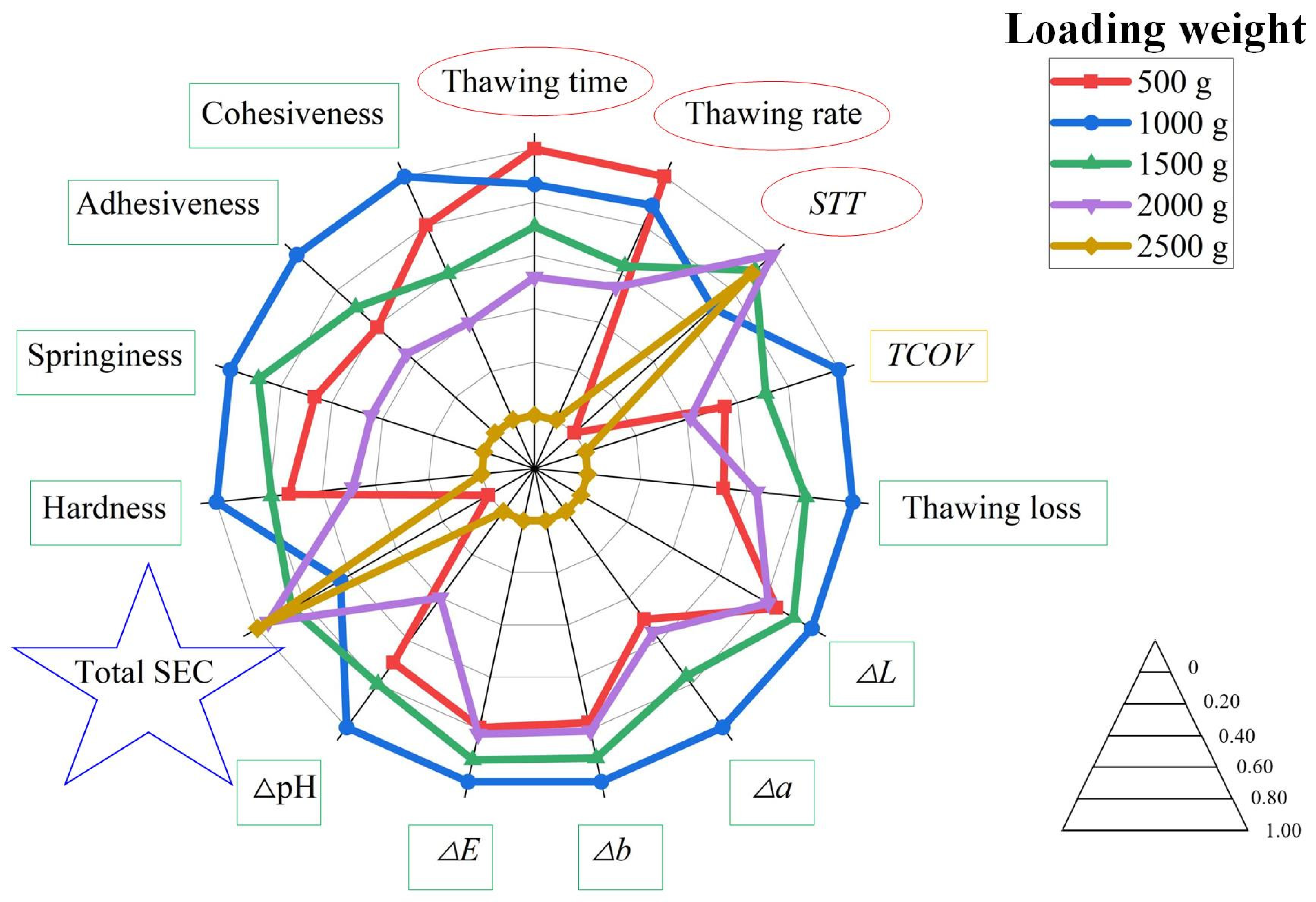 | Loading Weight/State | Thawing Loss (%) | Moisture Content (%) | L | a | b | ΔE | pH |