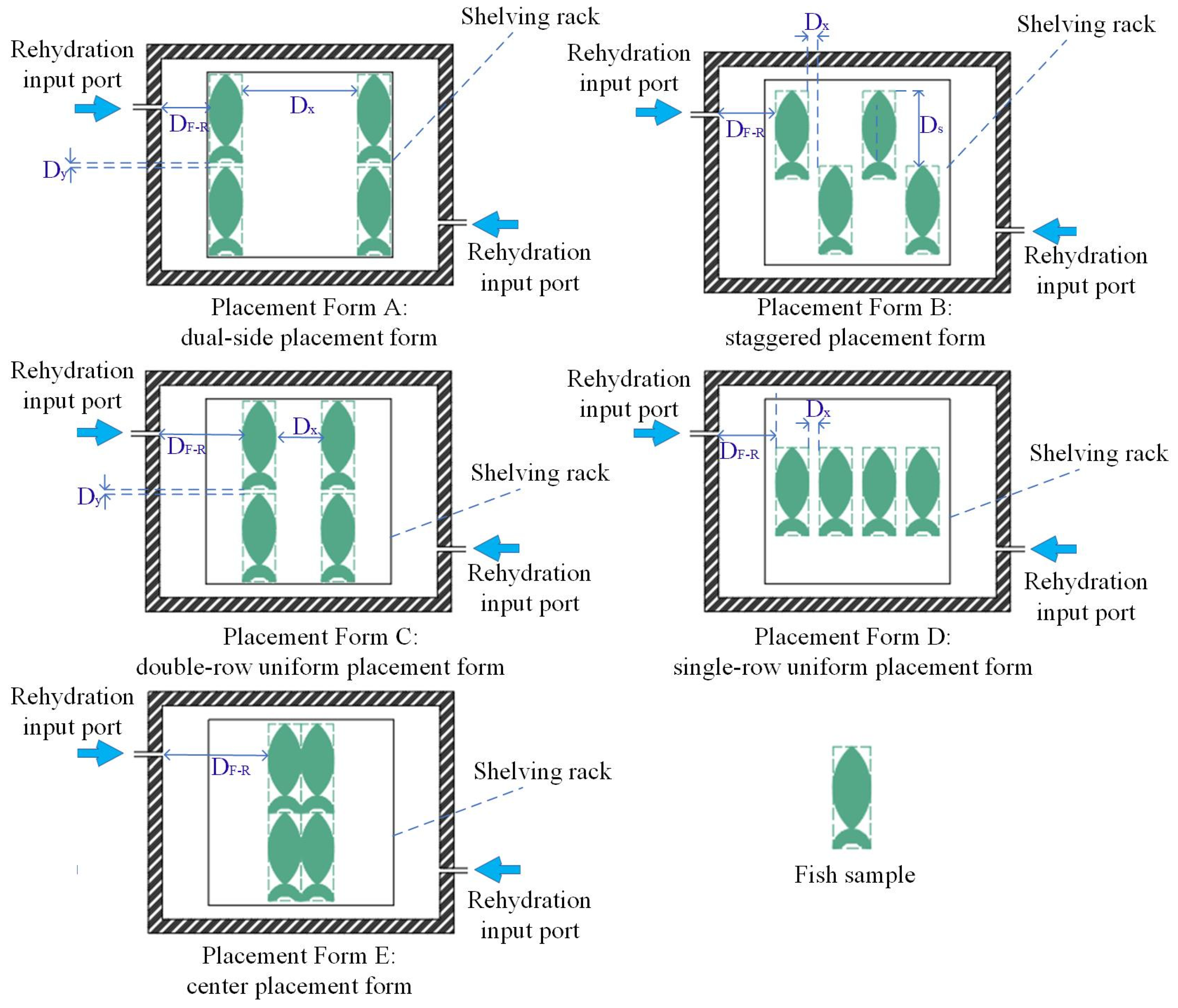 - Placement Form E: The fish samples were positioned the farthest from the rehydration input ports and the PWF-Fs were too narrow, which collectively resulted in the poorest thawing efficiency and thawing uniformity.