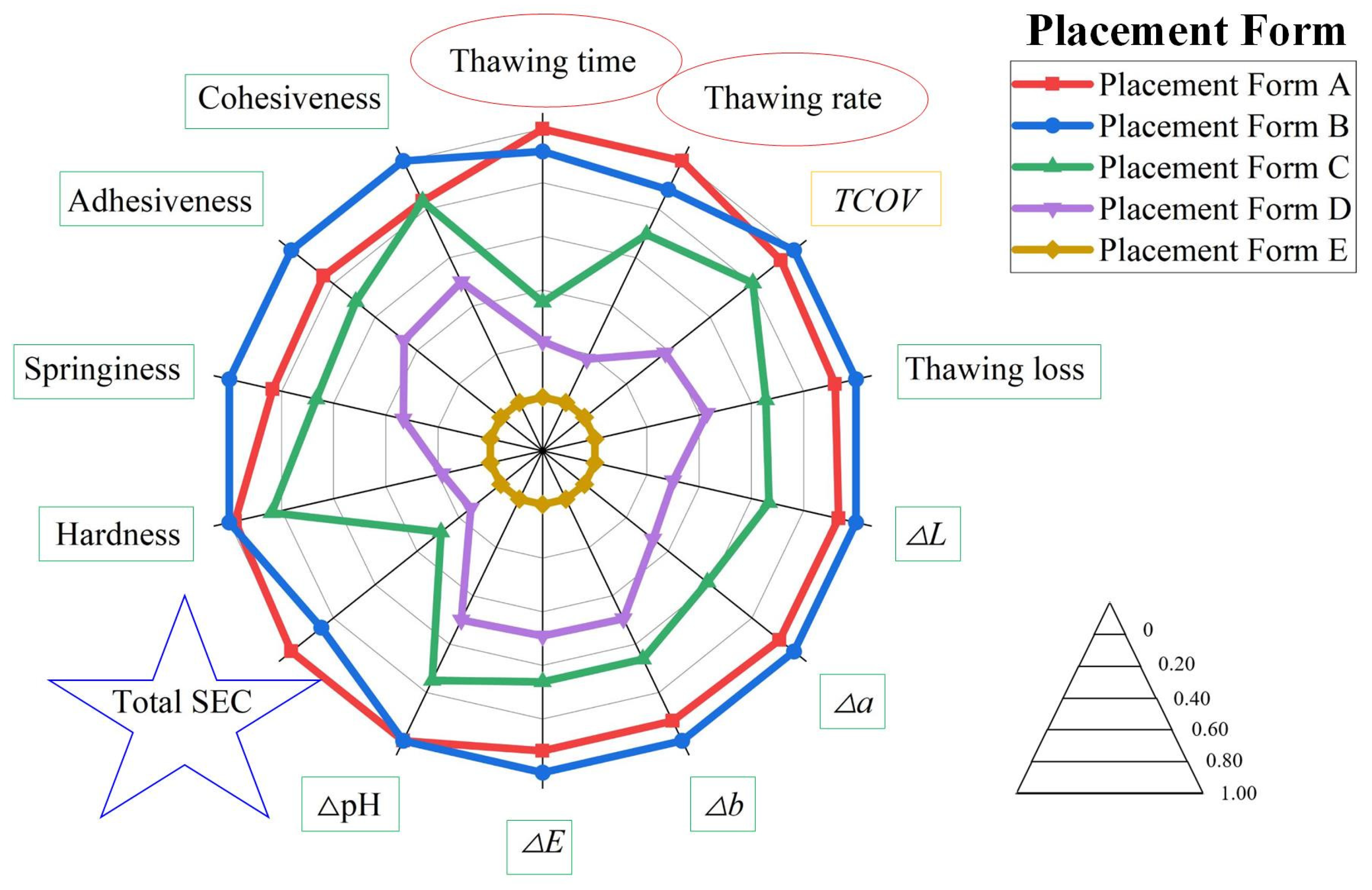 | Placement Form/State | Thawing Loss | pH | L | a | b | ΔE |