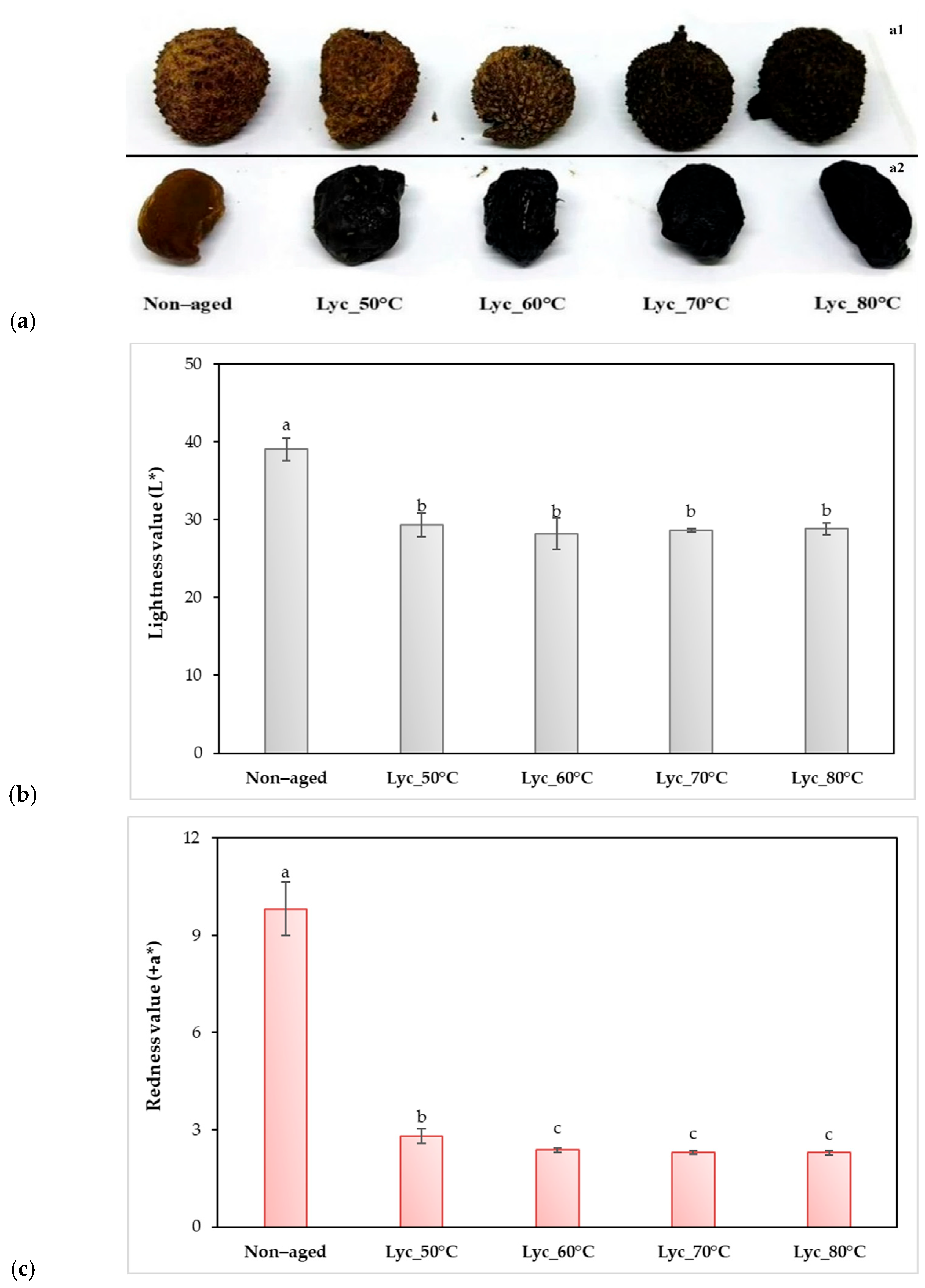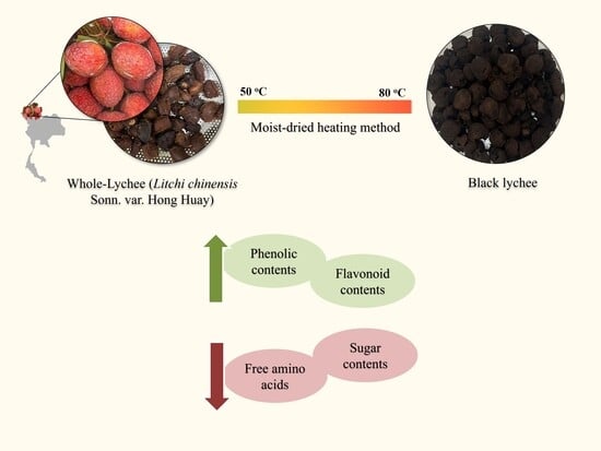 - Somjai, C.; Siriwoharn, T.; Kulprachakarn, K.; Chaipoot, S.; Phongphisutthinant, R.; Wiriyacharee, P. Utilization of Maillard reaction in moist-dry-heating system to enhance physicochemical and antioxidative properties of dried whole longan fruit. Heliyon 2021, 7, e07094. [Google Scholar] [CrossRef] [PubMed]