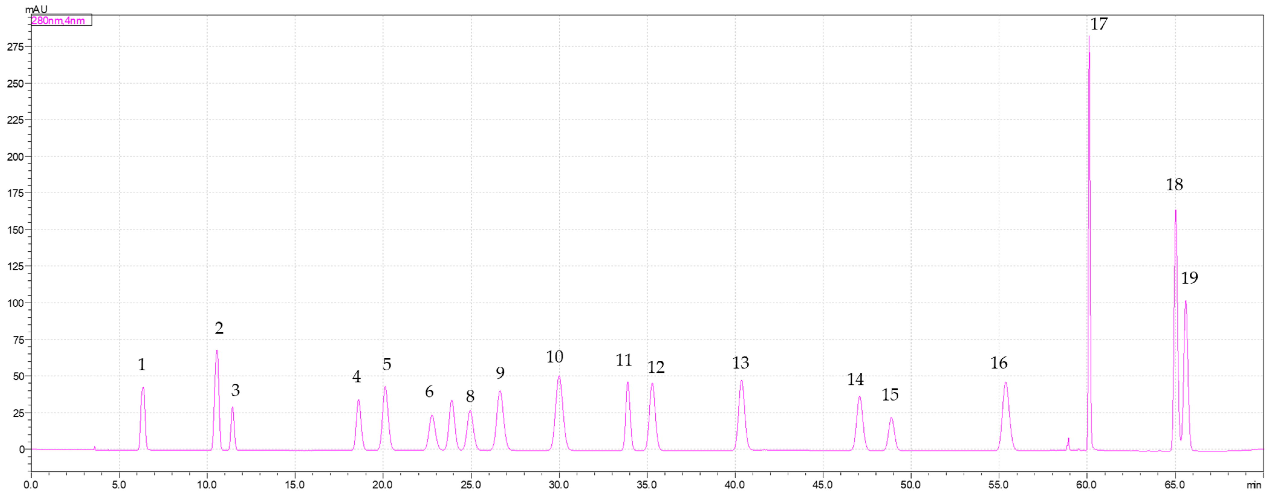 2.5.1. Determination of Phenolic Profiles by HPLC and Quantification of Total Phenolic and Flavonoid Contents by Spectrophotometry