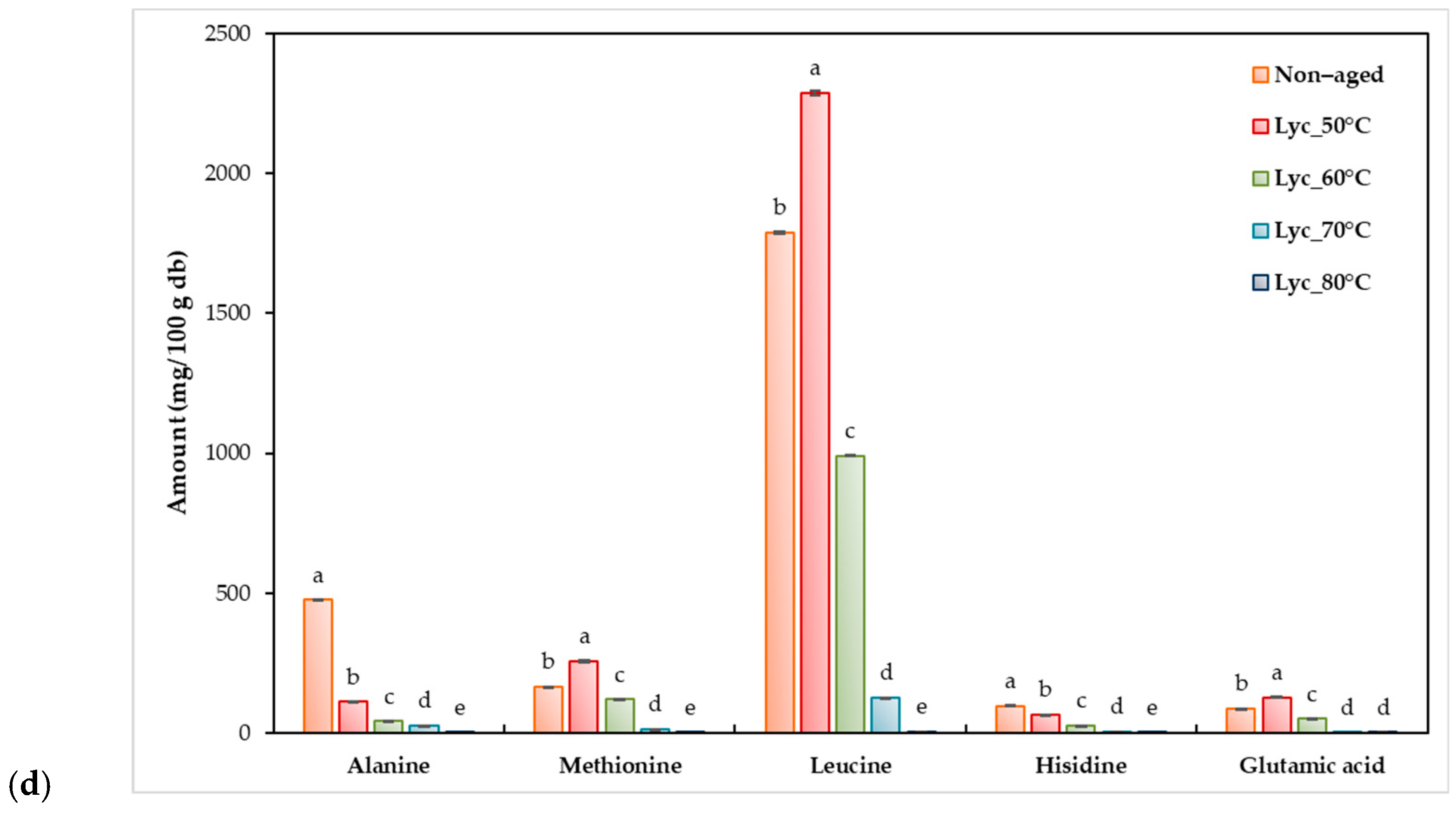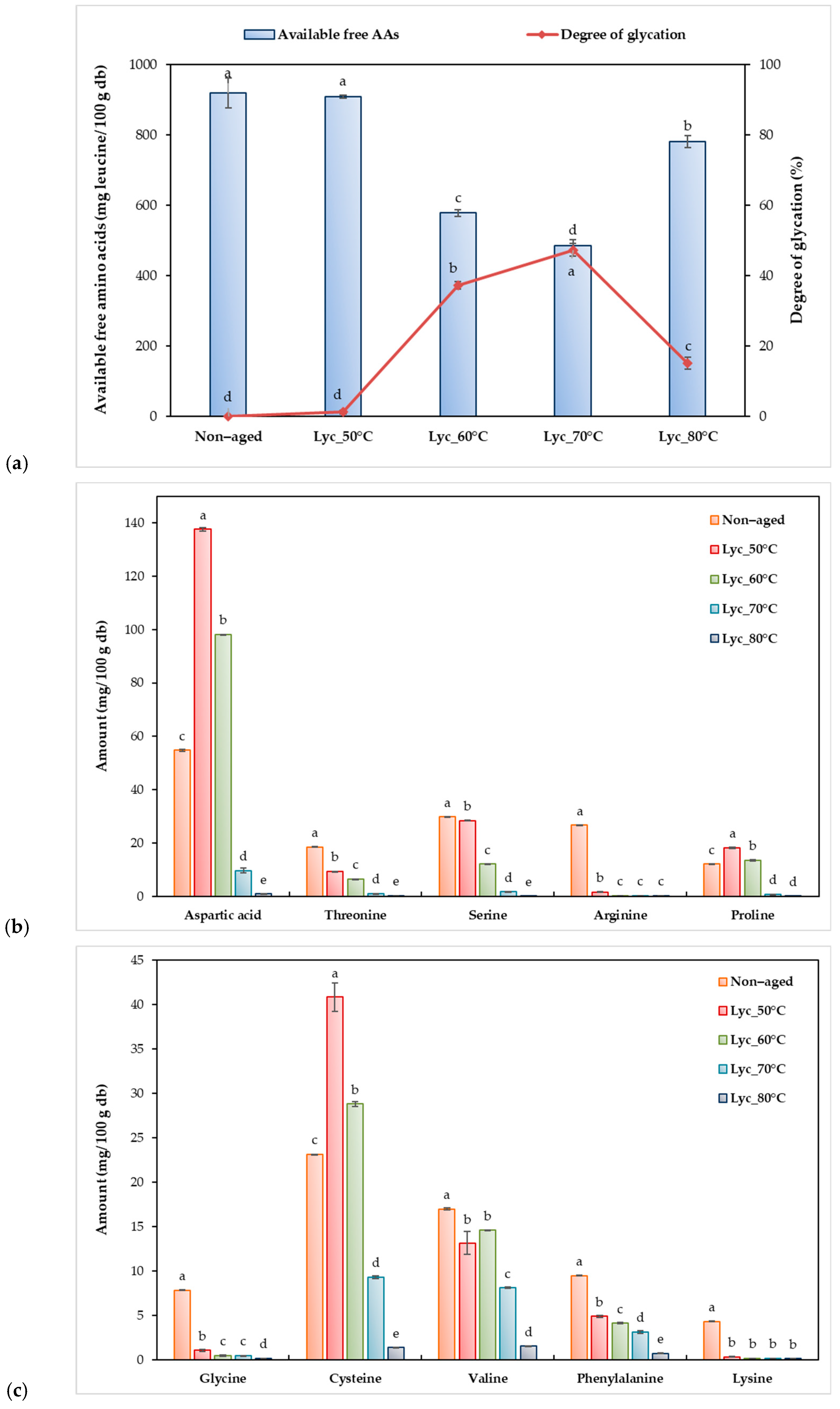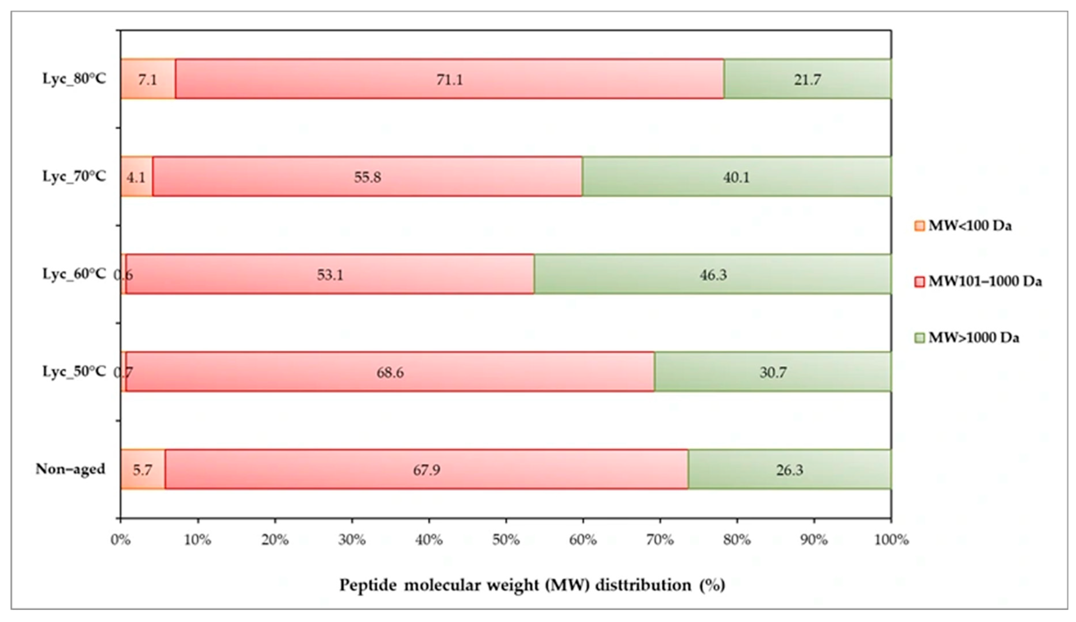3.4. Conjugation-Related Properties (Available Free Amino Acids, Degree of Glycation, Amino Acid Profiles, and Peptide Molecular Weight Distribution) of Dried Lychee Pulps Aged at Different Temperatures