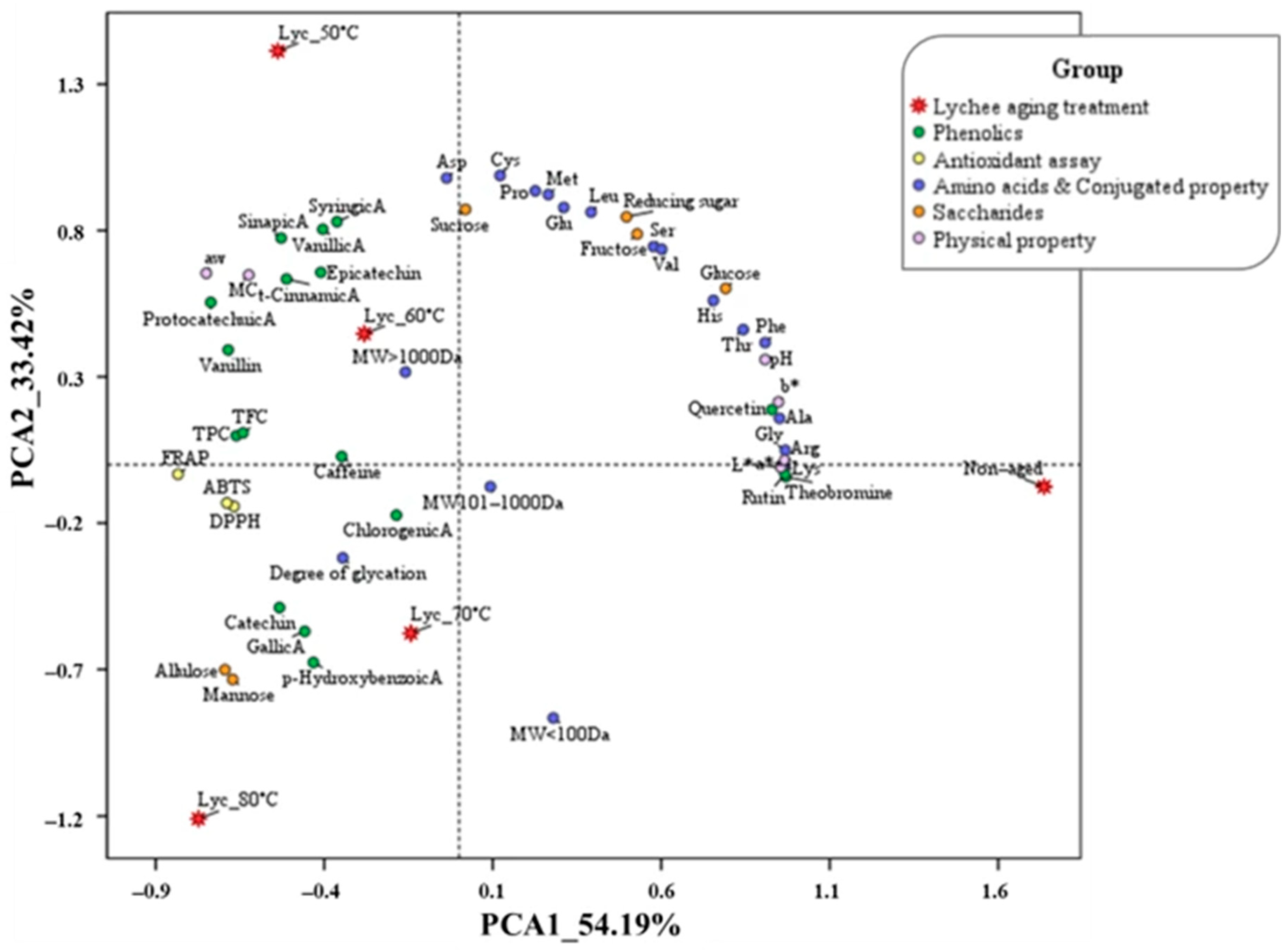 3.5. Antioxidant Activity and Its Correlation with Physicochemical and Conjugation-Related Properties of Dried Lychee Pulps Aged at Different Temperatures