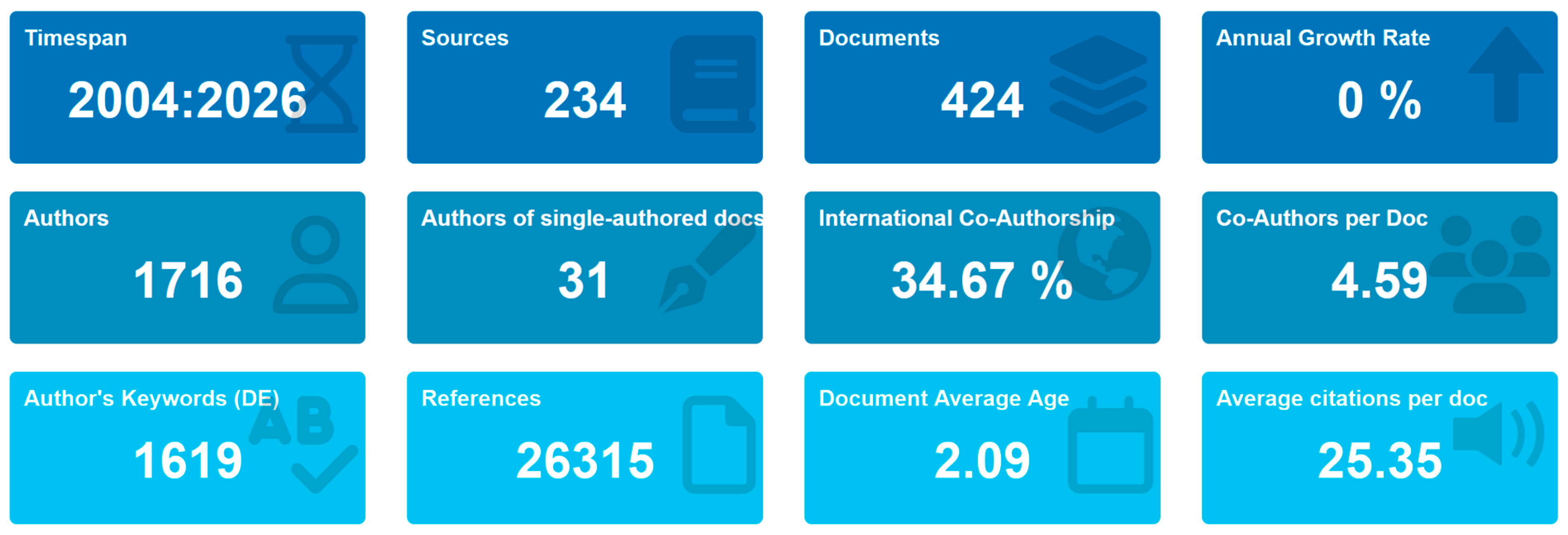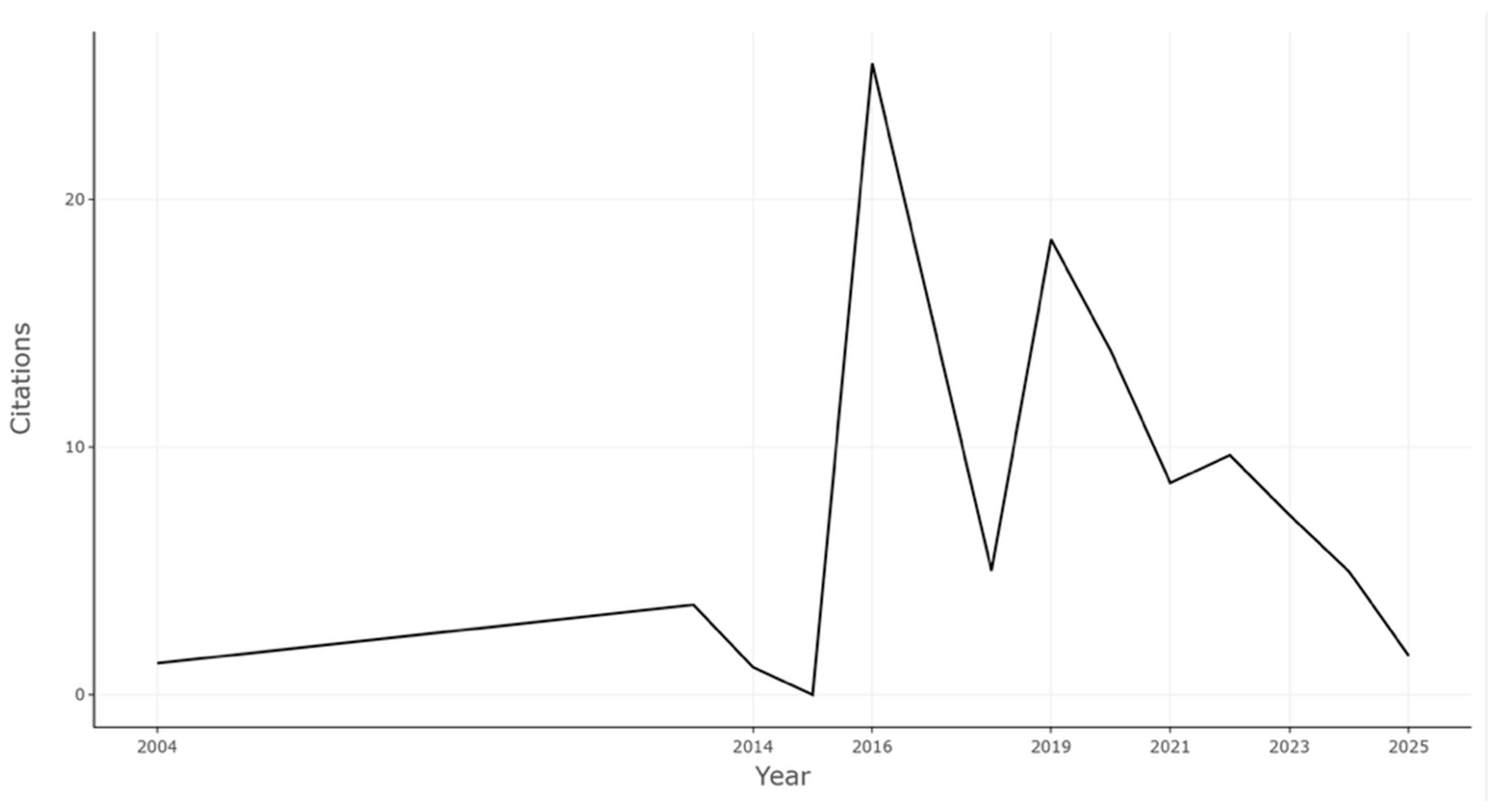 Figure 3 encapsulates the structural dynamics and productivity indicators of the analyzed corpus between 2004 and 2025 (some studies appear with a 2026 year of publication due to difference between the online publication year and the printed (issue/volume) publication year), offering an empirical overview of the field’s evolution. Over this twenty-one-year period, the dataset comprises