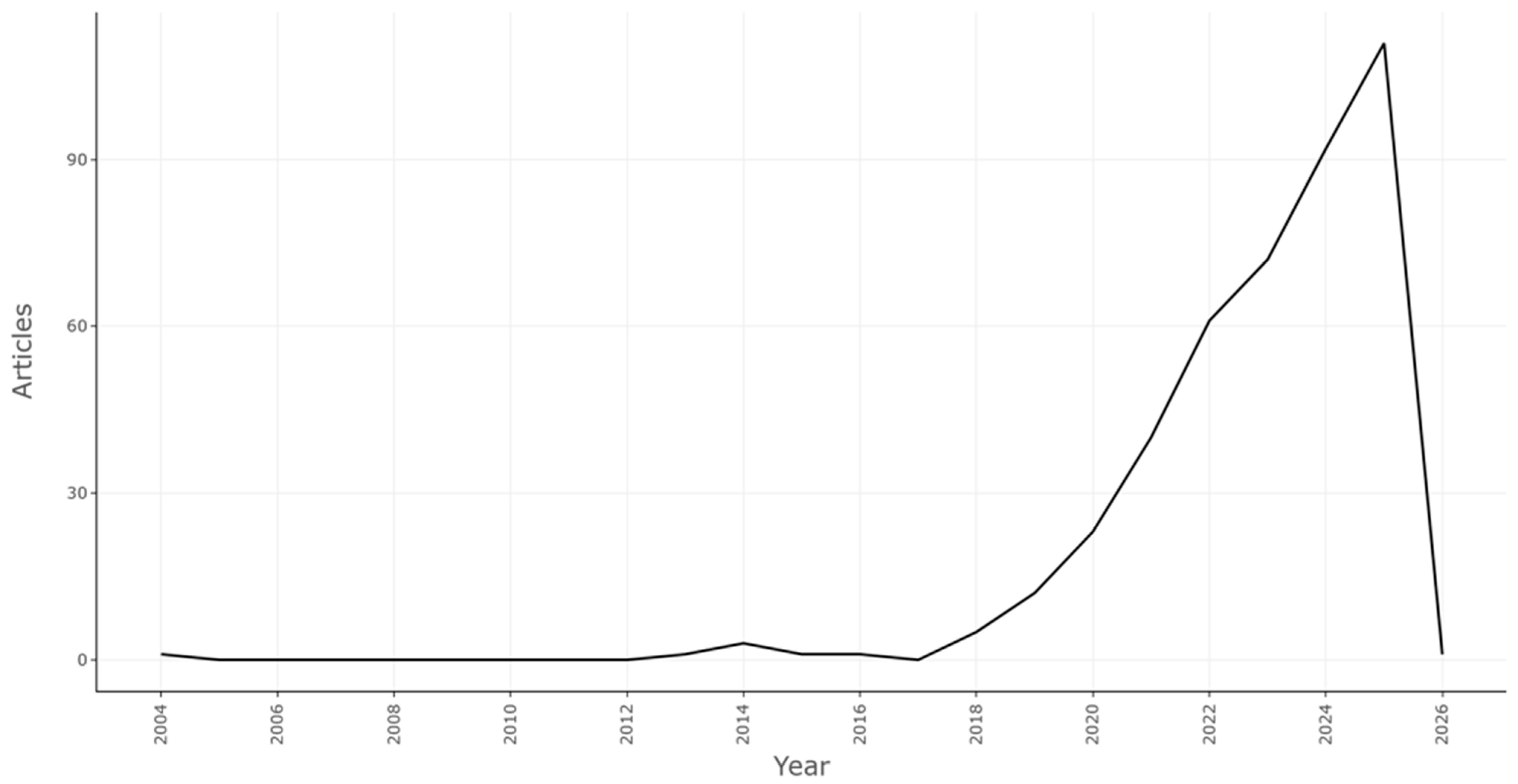 Figure 6, the field exhibits a distinct three-phase evolution: an incipient phase of sporadic publication activity (2004–2014), a period of accelerated growth and thematic diversification (2015–2022), and a phase of consolidation and reflexive maturity (2023–2026).
