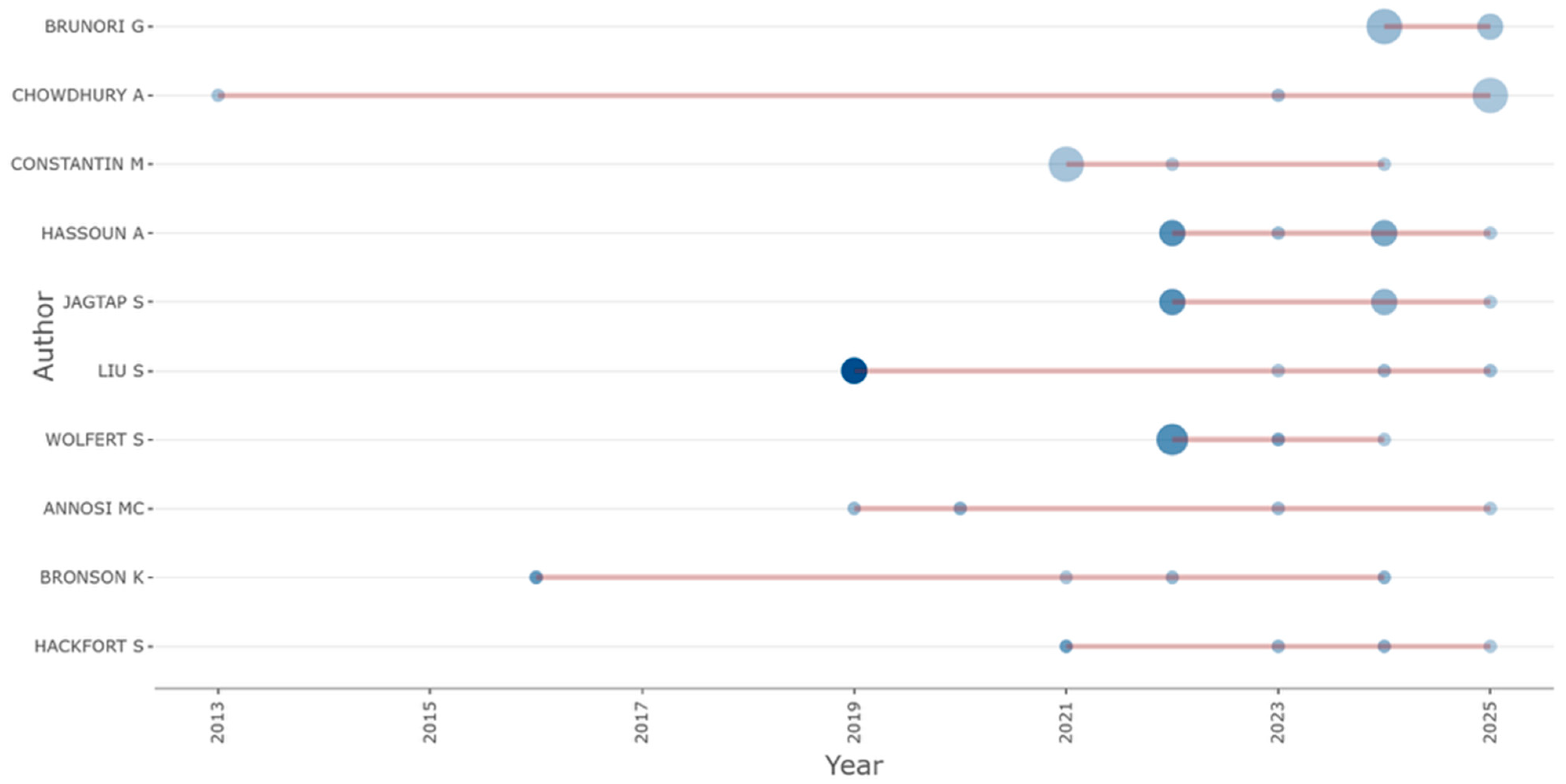 Figure 6) reinforces this dynamic, revealing the emergence of a stable cohort of prolific contributors—among them Brunori, Chowdhury, Constantin, Hassoun, and Wolfert—whose consistent publication trajectories have shaped the intellectual structure of the domain. The temporal overlap between these authors’ active periods suggests an increasingly networked community, where continuity of contribution and inter-authorship reinforce cumulative knowledge production. Notably, the proportional rise in co-authored papers since 2020 reflects the intensification of multi-institutional collaboration, an indicator of the field’s institutional consolidation and thematic specialization.