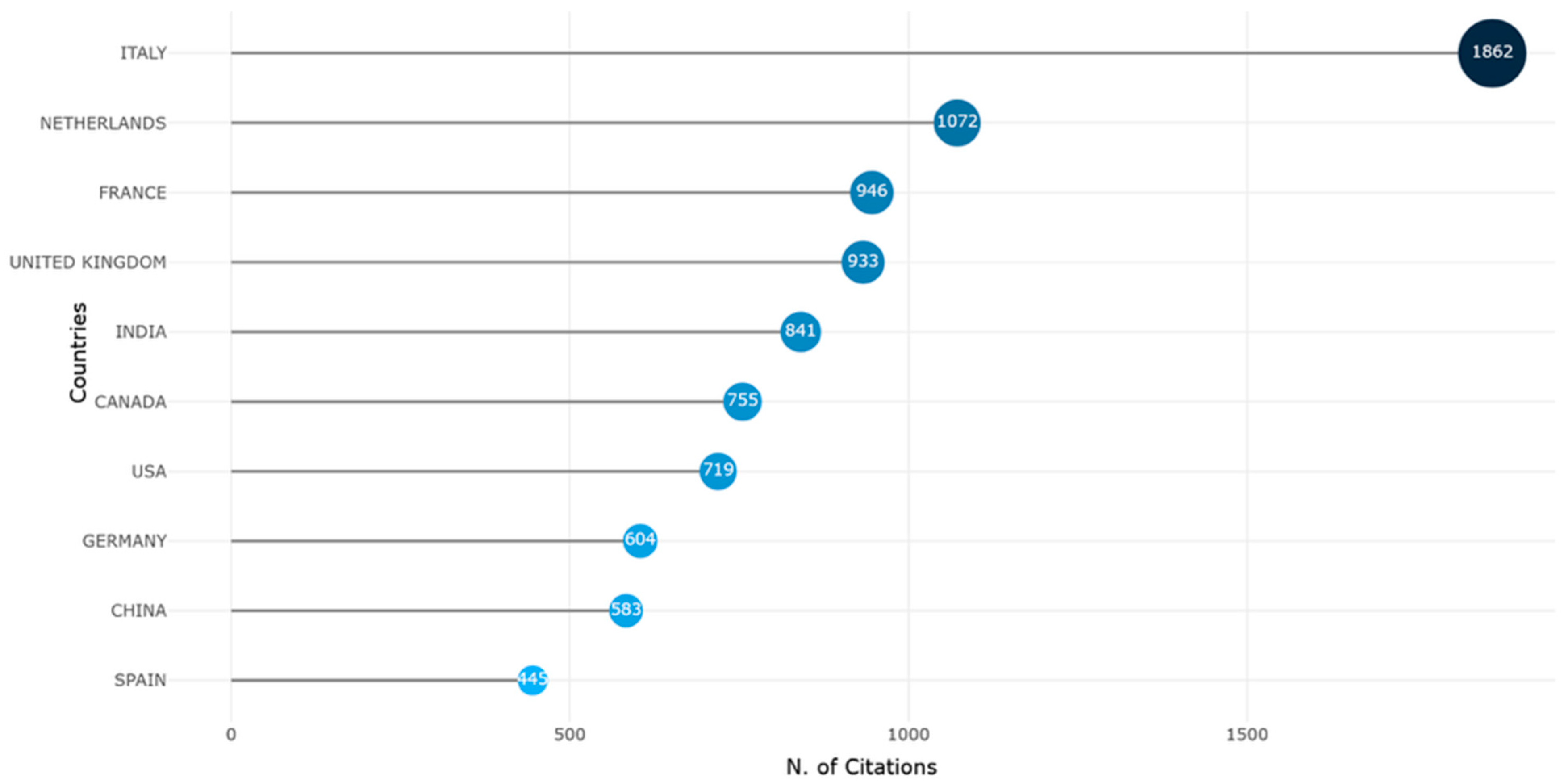 Figure 7) indicates the geographic distribution of scholarly influence. The vertical axis lists countries, while the horizontal axis represents the number of citations attributed to publications affiliated with institutions in those nations. The size and shading of the blue markers enhance the visibility of relative citation strength.