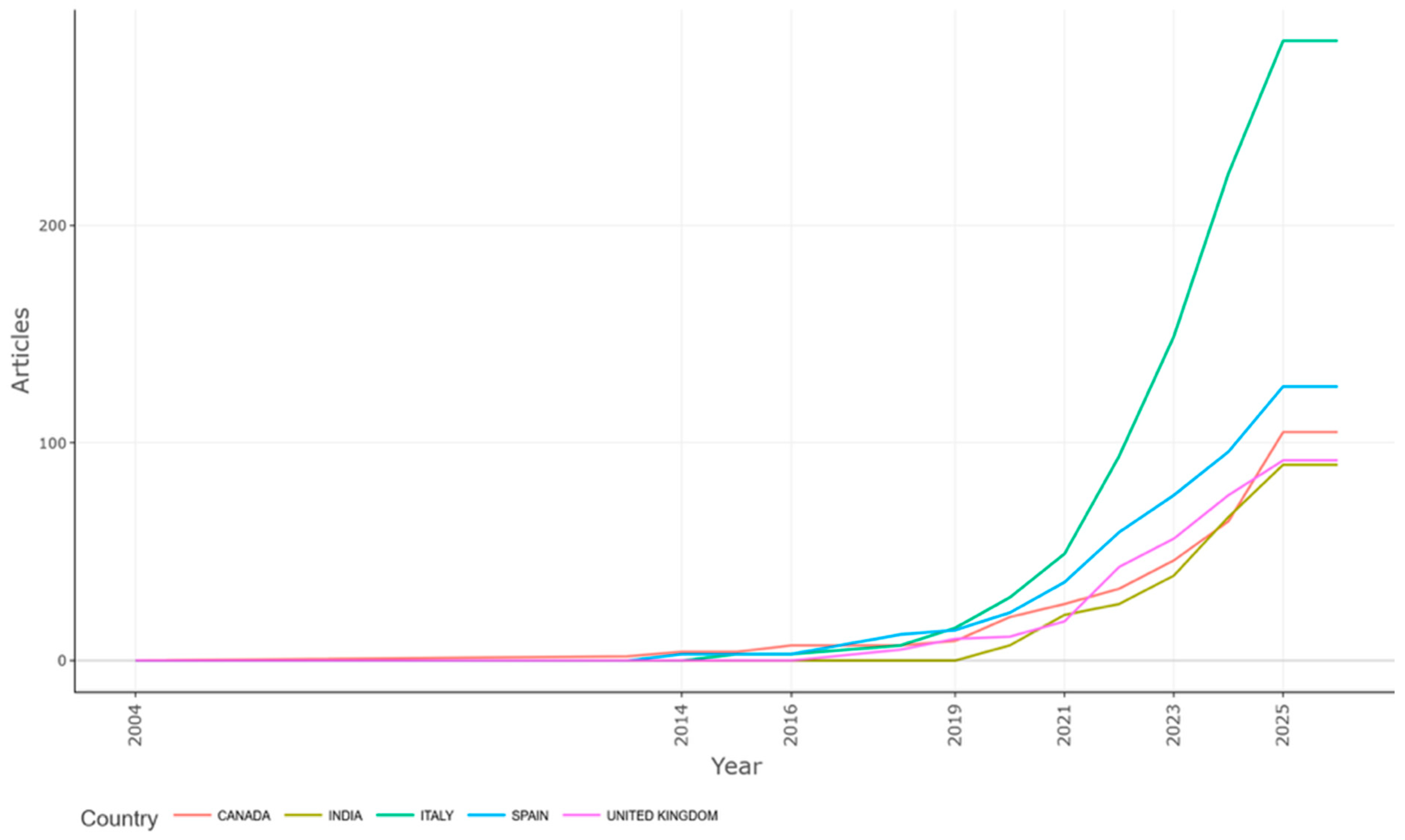 temporal evolution of scientific production in the field of digital agri-food systems across six leading countries—Canada, India, Italy, Spain, and the United Kingdom—over the period 2004 to 2025. The vertical axis represents the number of published articles, while the horizontal axis tracks the publication year. The data highlight a clear acceleration in research output starting around 2018, with a pronounced surge after 2020. This inflection point coincides with increasing global interest in digitalization as a response to sustainability challenges and systemic disruptions, including those triggered by the COVID-19 pandemic.