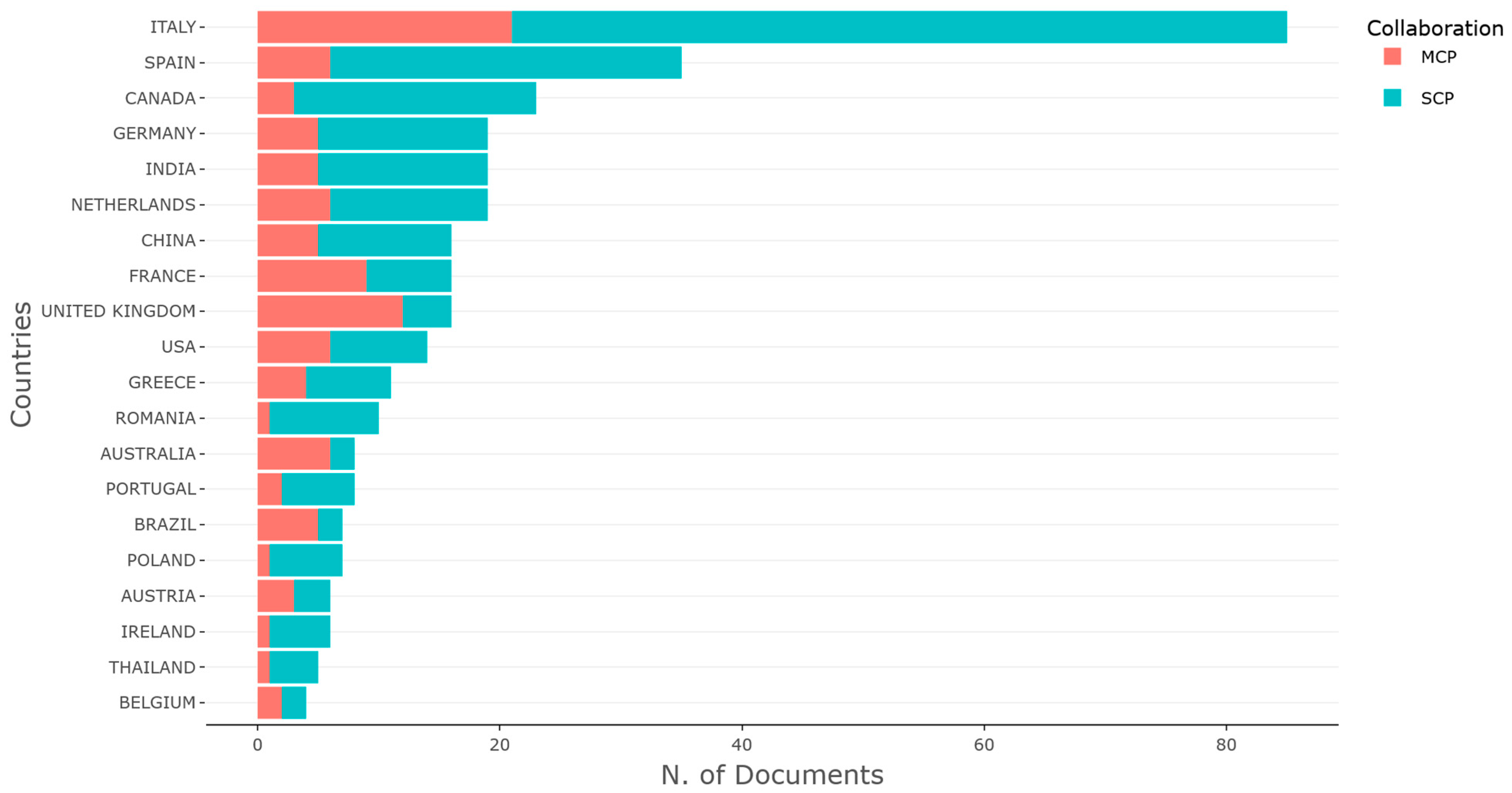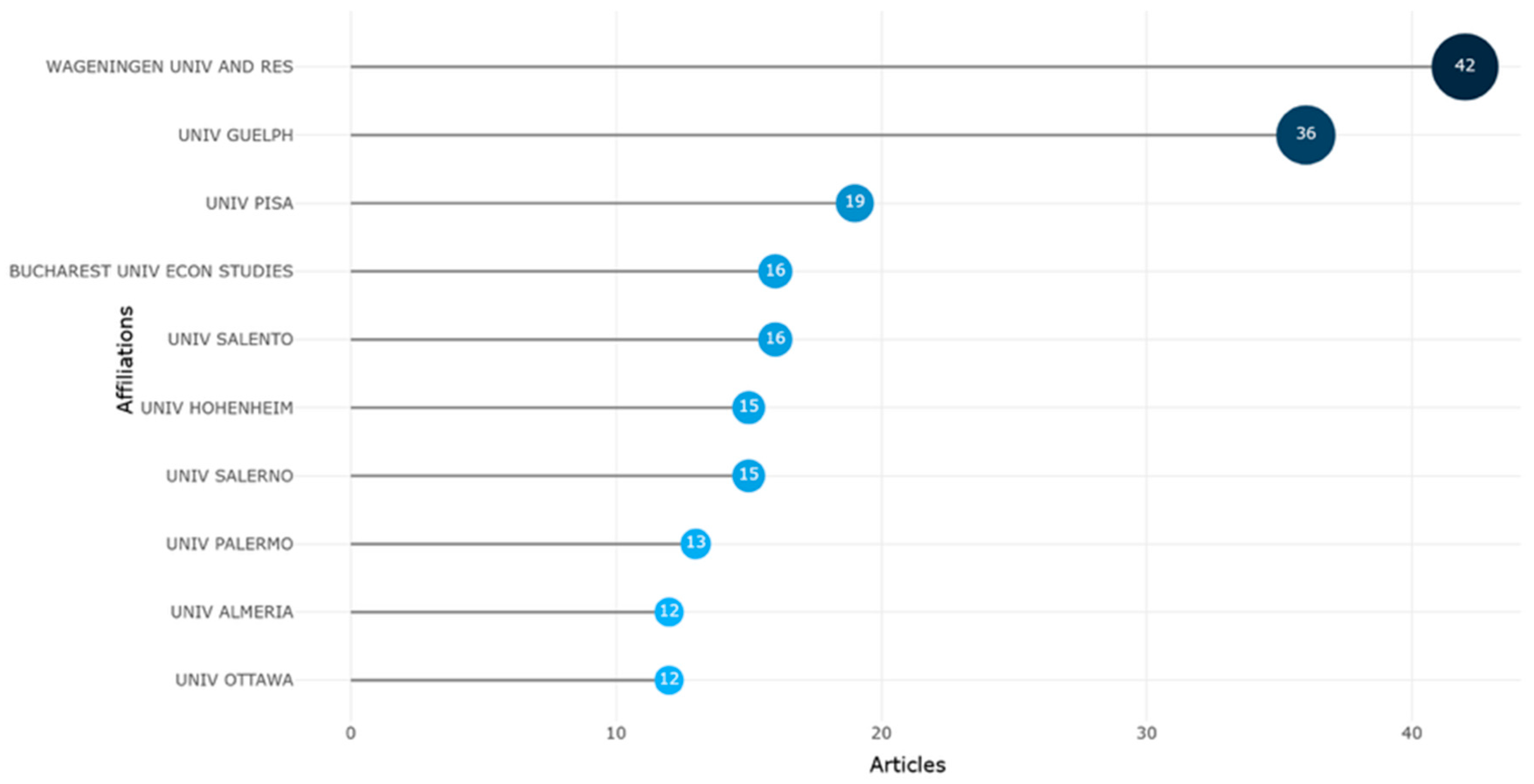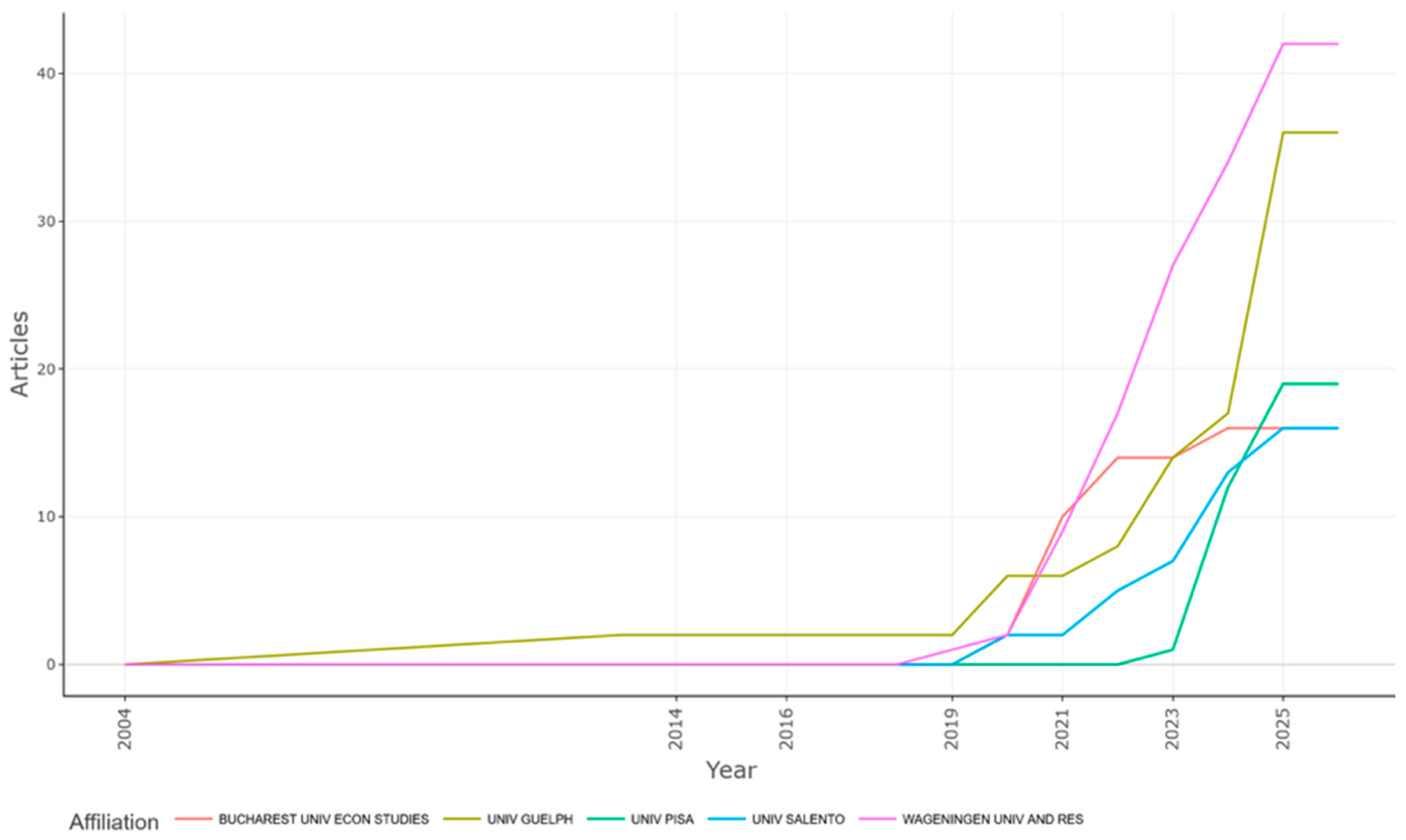 In contrast, only 31 single-authored publications were identified, representing a marginal proportion of the total corpus. This distribution underscores that knowledge creation is driven by inter-institutional consortia and project-based networks rather than individual scholarship. The bibliometric structure thereby mirrors the governance complexity of the agri-food sector itself, which relies on multi-actor collaboration and distributed expertise.