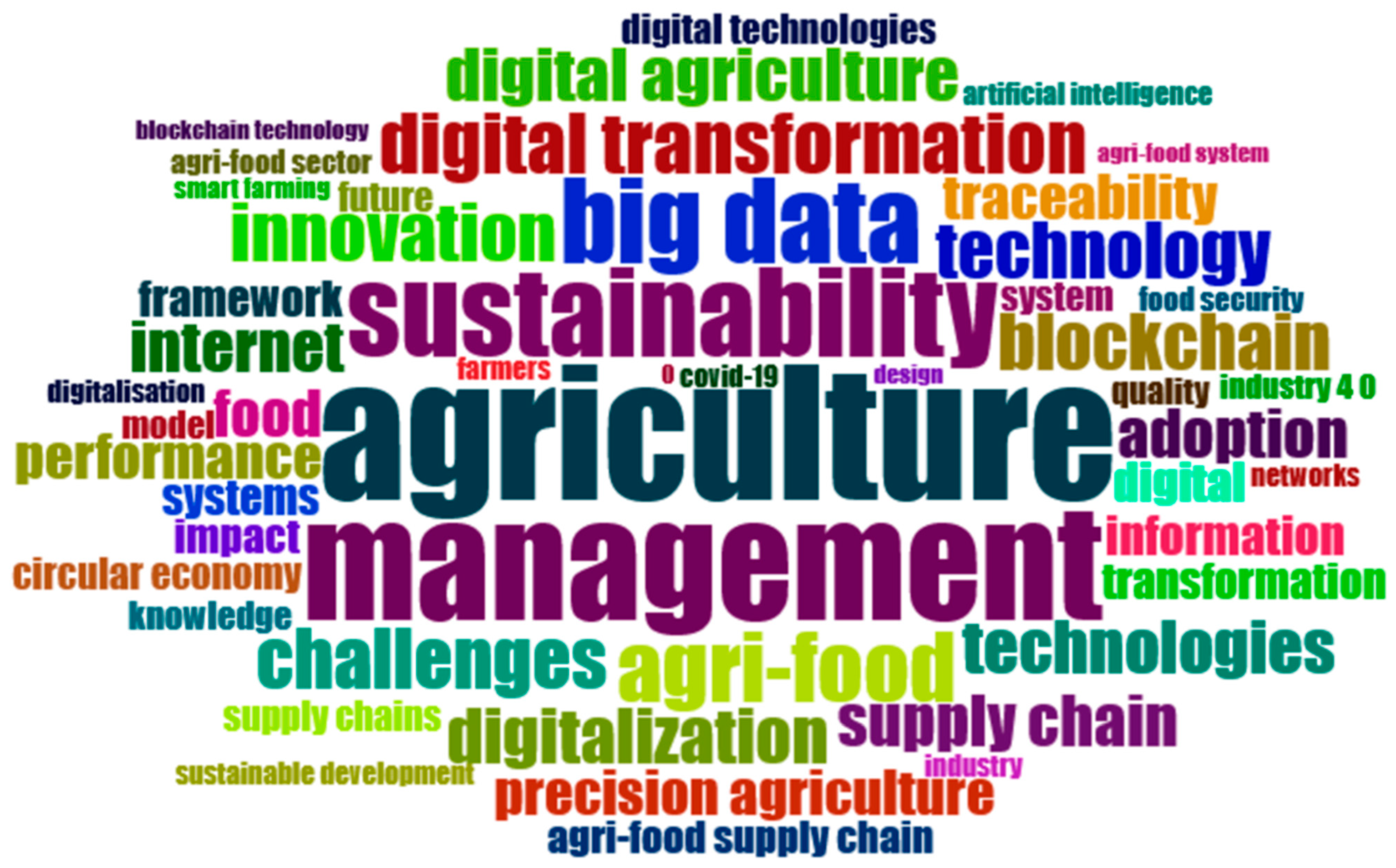 Central to the map are integrative concepts like sustainable development, agri-food, management, model, and adoption, which function as semantic bridges connecting multiple clusters. Their central position underlines their conceptual significance and the frequency with which they co-occur across otherwise distinct thematic areas.