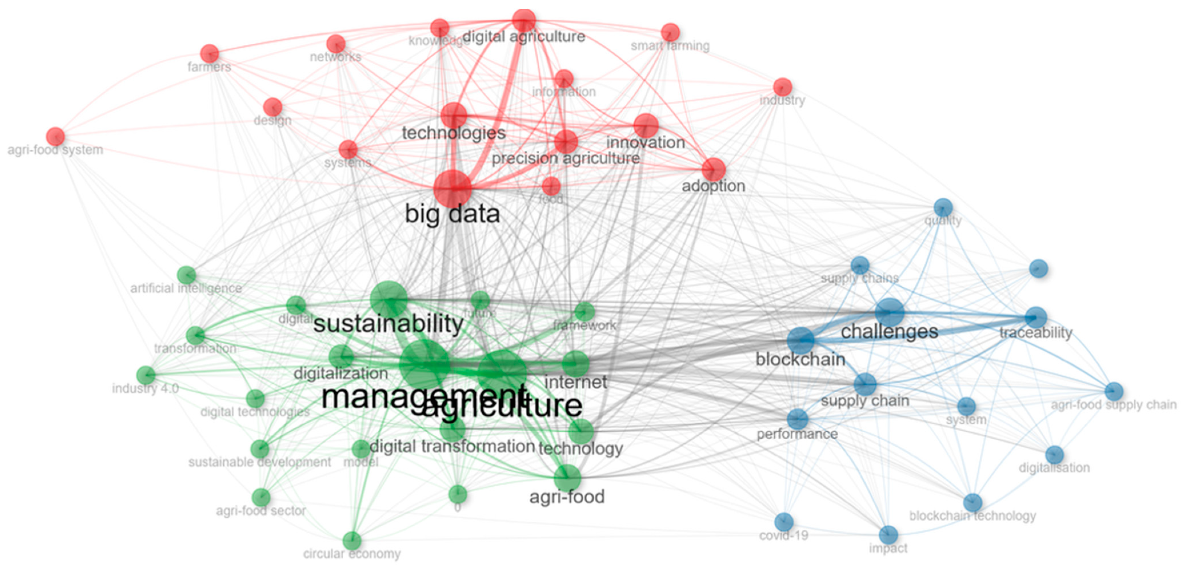 Bridging terms such as blockchain, Internet, and digitalization connect the three clusters, functioning as semantic intermediaries that facilitate cross-domain integration. These keywords enable convergence between the governance and ethical dimensions of sustainability (green cluster), the operational and technical imperatives of precision agriculture (red cluster), and the supply chain and risk mitigation concerns (blue cluster).