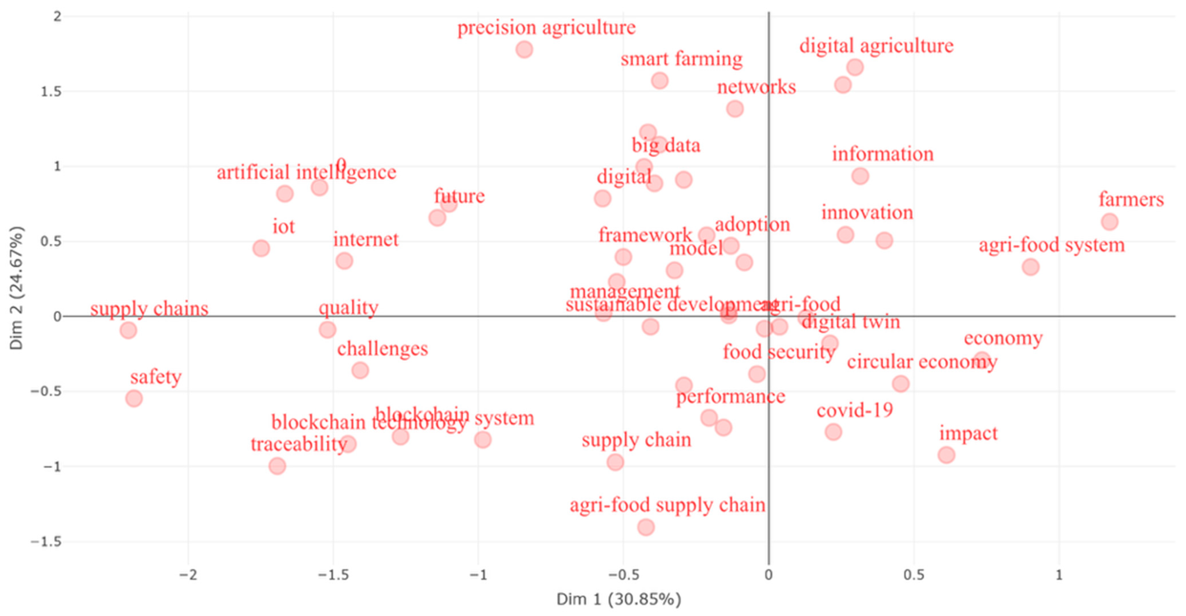 co-word factorial analysis of articles by cluster, a multivariate technique frequently used in bibliometric studies to reduce dimensionality and reveal latent structures within a corpus of scientific literature. The plot positions terms in a two-dimensional space—Dim 1 (30.85%) and Dim 2 (24.67%)—based on their frequency and co-occurrence patterns, thereby uncovering conceptual proximities and thematic relationships in the field of digital agri-food research.