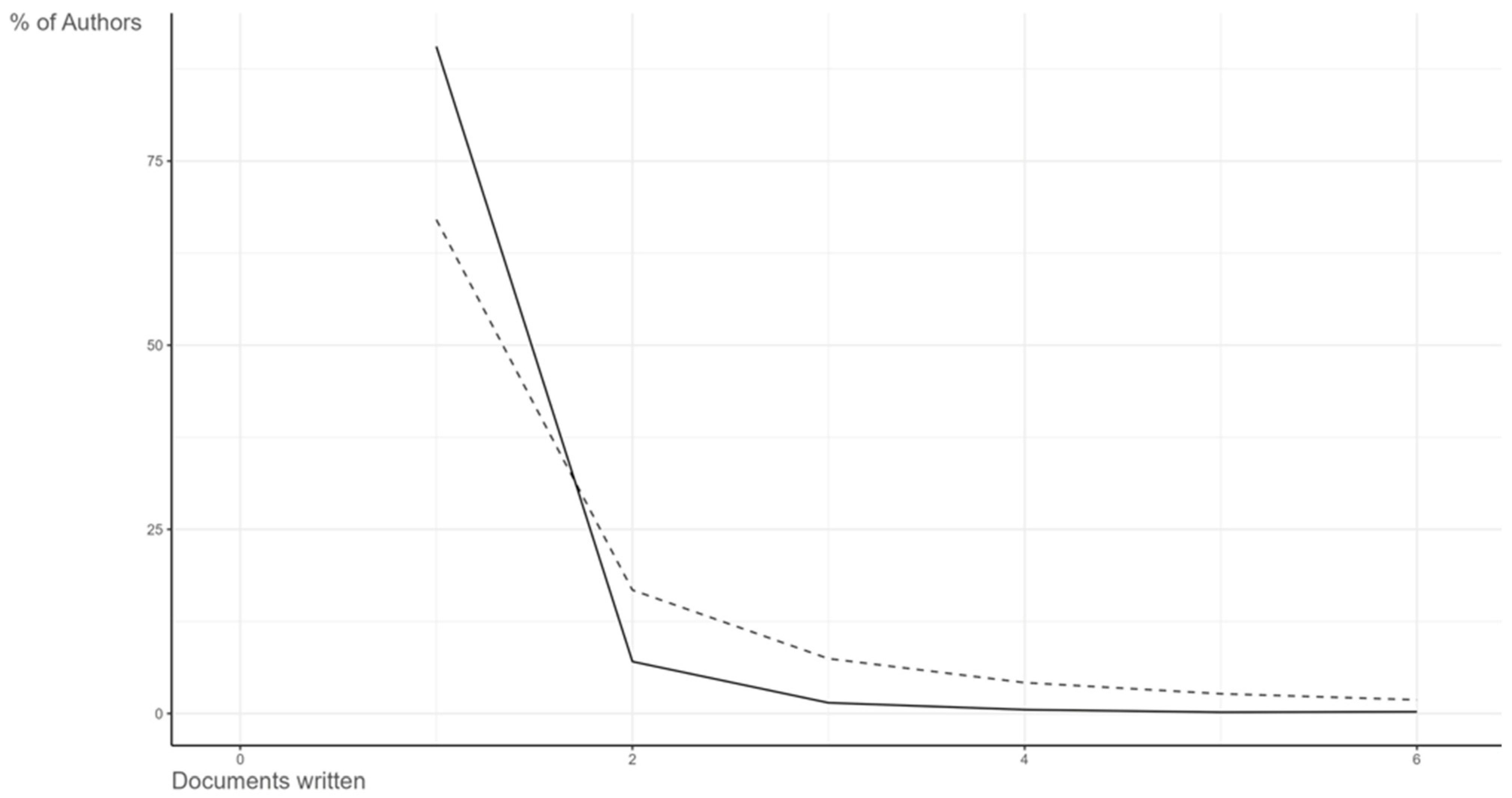 The analysis of authorial and citation patterns offers relevant insight into the distribution of intellectual influence and productivity within the research landscape on digital innovation in sustainable agri-food systems. The field exhibited a highly networked but asymmetrical authorship structure, where a relatively small number of scholars exerted a disproportionate influence on the evolution of knowledge, while a larger peripheral cohort contributed sporadically to the cumulative discourse. This power-law dynamic conforms closely to Lotka’s Law of scientific productivity, confirming the classical bibliometric observation that a minority of authors generate the majority of impactful contributions.