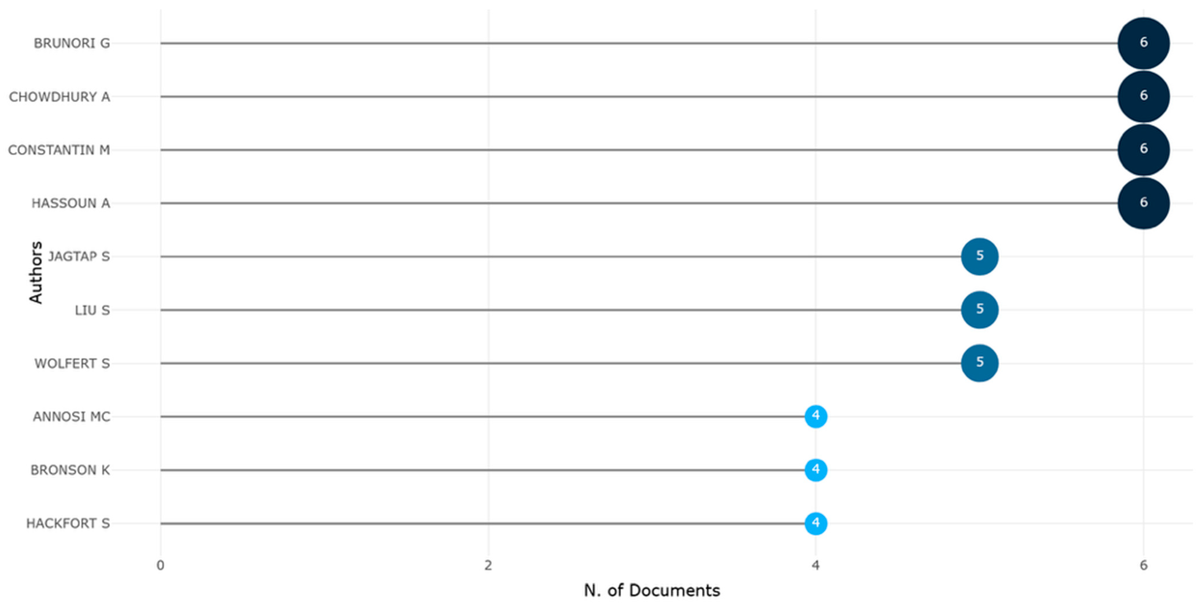 Figure 16), four authors—Brunori G., Chowdhury A., Constantin M., and Hassoun A.—were shown to lead the field with six publications each, indicating sustained engagement and likely centrality in shaping the conceptual foundations and empirical advancements of this interdisciplinary domain.