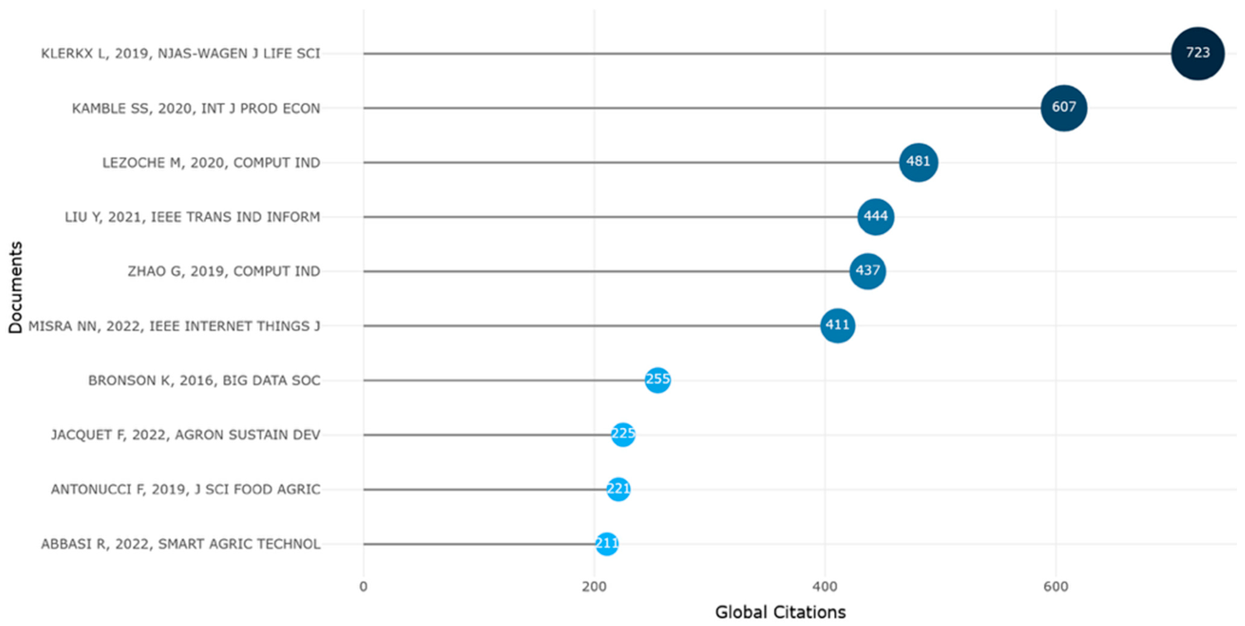 Mid-tier documents such as those by Bronson K. (2016), Jacquet F. (2022), and Antonucci F. (2019) mark the field’s diversification, addressing pivotal dimensions such as digital ethics, agroecological innovation, and technological adoption. Abbasi R. (2022), while more recent, already shows a notable citation footprint, hinting at the paper’s potential to become a future reference point.